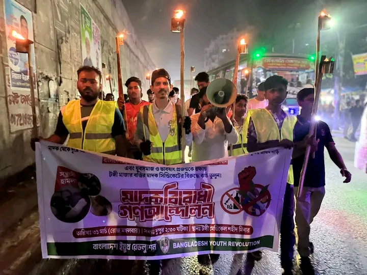 টঙ্গীতে বাংলাদেশ ইয়ুথ রেভ্যুলেশন সংগঠনের নেতাকর্মীদের ওপর অতর্কিত হামলার ঘটনা ঘটেছে। এই হামলার প্রতিবাদে এবং এলাকায় সব ধরনের মাদক ব্যবসা ও সেবন নিষিদ্ধের দাবিতে উত্তাল হয়ে উঠেছে রাজপথ। পরিস্থিতি নিয়ন্ত্রণে এবং মাদক নির্মূলের লক্ষে সংগঠনের পক্ষ থেকে এলাকায় একটি বিশাল মশাল মিছিল বের করা হয়।