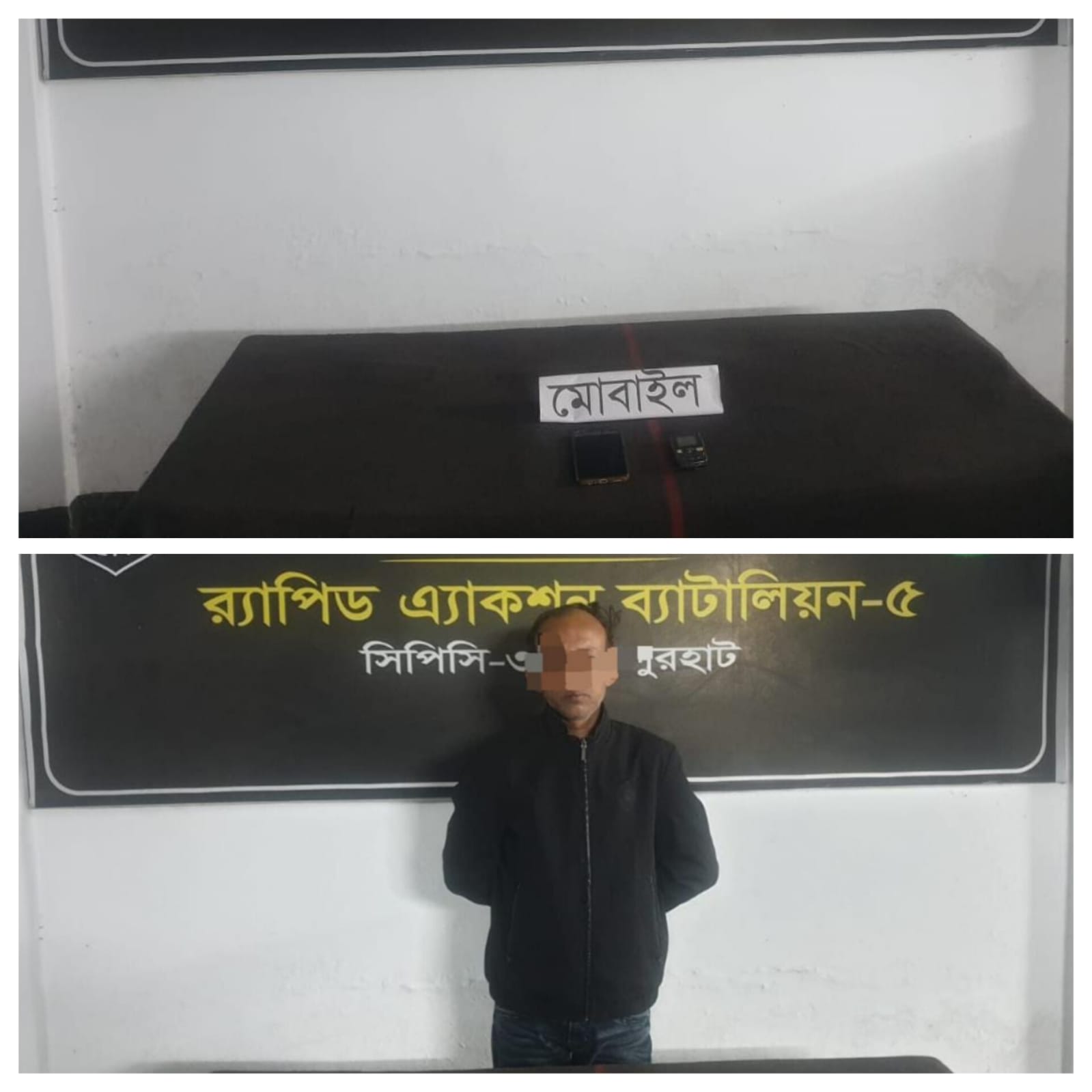 এরই ধারাবাহিকতায় ১৩ জানুয়ারি ২০২৬ তারিখ ০১০৫ ঘটিকায় নওগাঁ জেলার ধামুরহাট থানাধীন খরমপুর এলাকা হতে সহকারী শিক্ষক নিয়োগ পরীক্ষা-২০২৫ এর প্রশপত্র ফাঁসের ঘটনায় জড়িত তদন্তেপ্রাপ্ত পলাতক আসামী ১। মোঃ আনোয়ার হোসেন (৪১), পিতা-মোঃ মোজাফফর রহমান,সাং-বরমপুর, থানা-ধামইরহাট,জেলা- নওগাঁকে গ্রেফতার করে। ঘটনা সূত্রে জানা যায়, গত ০৯ জানুয়ারি ২০২৬ তারিখ জয়পুরহাট সরকারি বালিকা উচ্চ বিদ্যালয়ে সহকারী শিক্ষক নিয়োগ পরীক্ষা-২০২৫ চলাকালে বিকাল ১৬০০ ঘটিকায় উক্ত পরীক্ষা কেন্দ্রের ২য় তলার কক্ষ নং-২০২ এর পরীক্ষার্থী মোঃ আমির হামজা, বোল নং-৪৪১৪৮০০ এর ব্যবহৃত মোবাইলে এসএমএস দেখে উত্তর পূরণ করছেন। এ বিষয়ে সংশ্লিষ্ট কক্ষ পরিদর্শক পরীক্ষার্থী আমির হামজাকে জিজ্ঞাসা করলে সে তার ব্যবহৃত মোবাইল নং০১৩৪২৬১৫১৯২ এ মোবাইল নং- ০১৩৩৬৫৩৩৫১৯ হতে প্রাপ্ত এসএমএস থেকে উত্তরপত্র পূরণ করছেন মর্মে স্বীকার করেন। সংশ্লিষ্ট কক্ষ পরিদর্শক উক্ত এসএমএস এর সাথে পরীক্ষার্থী আমির হামজার উত্তরের মিল বুজে পাওয়ায় তাৎক্ষনিকভাবে বিষয়টি বর্ণিত পরীক্ষা কেন্দ্রে দায়িত্বরত জেলা প্রাথমিক শিক্ষা অফিসার প্রতিনিধি জনাব সাকিল আহম্মেদকে অবগত করলে তিনি জয়পুরহাট সদর থানা পুলিশকে অবগত করেন। জয়পুরহাট সদর থানা পুলিশ একই তারিখ ১৬৩৫ ঘটিকায় ঘটনাস্থলে উপস্থিত হয়ে পরীক্ষার্থী আমির হামজাকে উপস্থিত সাক্ষীদের সামনে জিজ্ঞাসাবাদ করলে সে সহকারী শিক্ষক নিয়োগ পরীক্ষা-২০২৫ এর পরীক্ষায় অজ্ঞাতনামা আসামিদের সহায়তায় সৃজন প্রশ্নের উত্তর মোবাইল ফোনে এসএমএস এর মাধ্যমে অসৎ পন্থা অবলম্বন করেছে মর্মে ঘটনার সত্যতা স্বীকার করেন। এ সংক্রান্তে জেলা প্রাথমিক শিক্ষা অফিসার প্রতিনিধি সাকিল আহম্মেদ (৫২), পিতা-মৃত ফজলুর রহমান সরদার, সাং-লক্ষীকোলা, থানা-শিবগঞ্জ, জেলা-বগুড়া, এ/পি- উপজেলা এডুকেশন ট্রেনিং সেন্টার, থানা-ক্ষেতলাল, জেলা-জয়পুরহাট এর লিখিত অভিযোগের প্রেক্ষিতে জয়পুরহাট সদর থানার মামলা নং-০৯ তারিখ-০৯ জানুয়ারি ২০২৬, ধারা-৪/৯/১৩ The Public Examination (Offences) Act-1980 রুজু হয়। উক্ত মামলার তদন্তকারী অফিসারের অধিযাচনের প্রেক্ষিতে ব্যাব-৫, সিপিসি-৩ এর আভিযানিক দল উক্ত মামলার ঘটনায় জড়িত তদন্তেপ্রাপ্ত আসামি আনোয়ার হোসেনকে গ্রেফতারের জন্য তৎপর হয়। অতঃপর ১৩ জানুয়ারি ২০২৬ খ্রিঃ ০১০৫ ঘটিকায় র্যাব-৫. সিপিসি-৩ এর একটি চৌকস আভিযানিক দল গোপন সংবাদের ভিত্তিতে নওগাঁ জেলার ধামইরহাট থানাধীন খরমপুর এলাকা হতে উল্লেখিত মামলার তদন্তেপ্রাপ্ত পলাতক আসামি আনোয়ার হোসেনকে গ্রেফতার করতে সক্ষম হয়। গ্রেফতারকৃত আসামিকে পরবর্তী আইনগত ব্যবস্থা গ্রহণের জন্য জয়পুরহাট জেলার সদর থানায় হস্তান্তর করা হয়েছে। এ সময় উপস্থিত ছিলেন