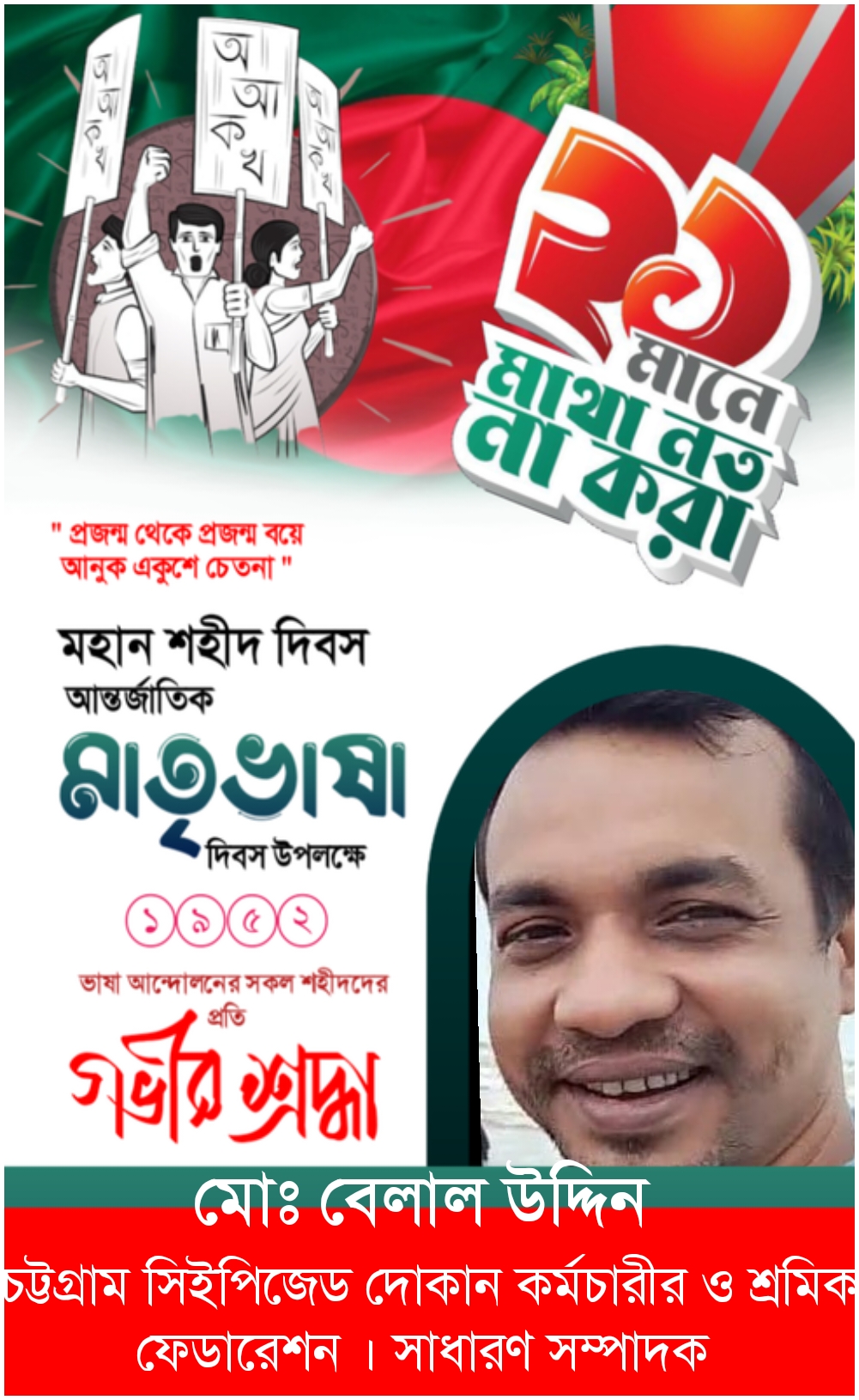 দিবসটি উপলক্ষে দেশবাসী ও বিশ্বের সকল ভাষাভাষী মানুষকে শুভেচ্ছা জানিয়ে চট্টগ্রাম সি ই পি জেড দোকান কর্মচারী ও শ্রমিক ফেডারেশনের সাধারণ সম্পাদক মোঃ বেলাল উদ্দিন এক বিশেষ বিবৃতি দিয়েছেন। বাণীতে তিনি বলেন, “একুশে ফেব্রুয়ারি আমাদের জাতীয় জীবনের এক অবিস্মরণীয় অধ্যায় এবং গৌরবের প্রতীক। ৫২-র ভাষা আন্দোলন কেবল ভাষার অধিকার প্রতিষ্ঠাই করেনি, বরং বাঙালির স্বাধিকার, গণতন্ত্র ও সাংস্কৃতিক চেতনার ভিত্তিকে মজবুত করেছে। একুশের এই রক্তাক্ত পথ ধরেই মহান মুক্তিযুদ্ধের মধ্য দিয়ে আমরা অর্জন করেছি বাংলাদেশের স্বাধীনতা।”