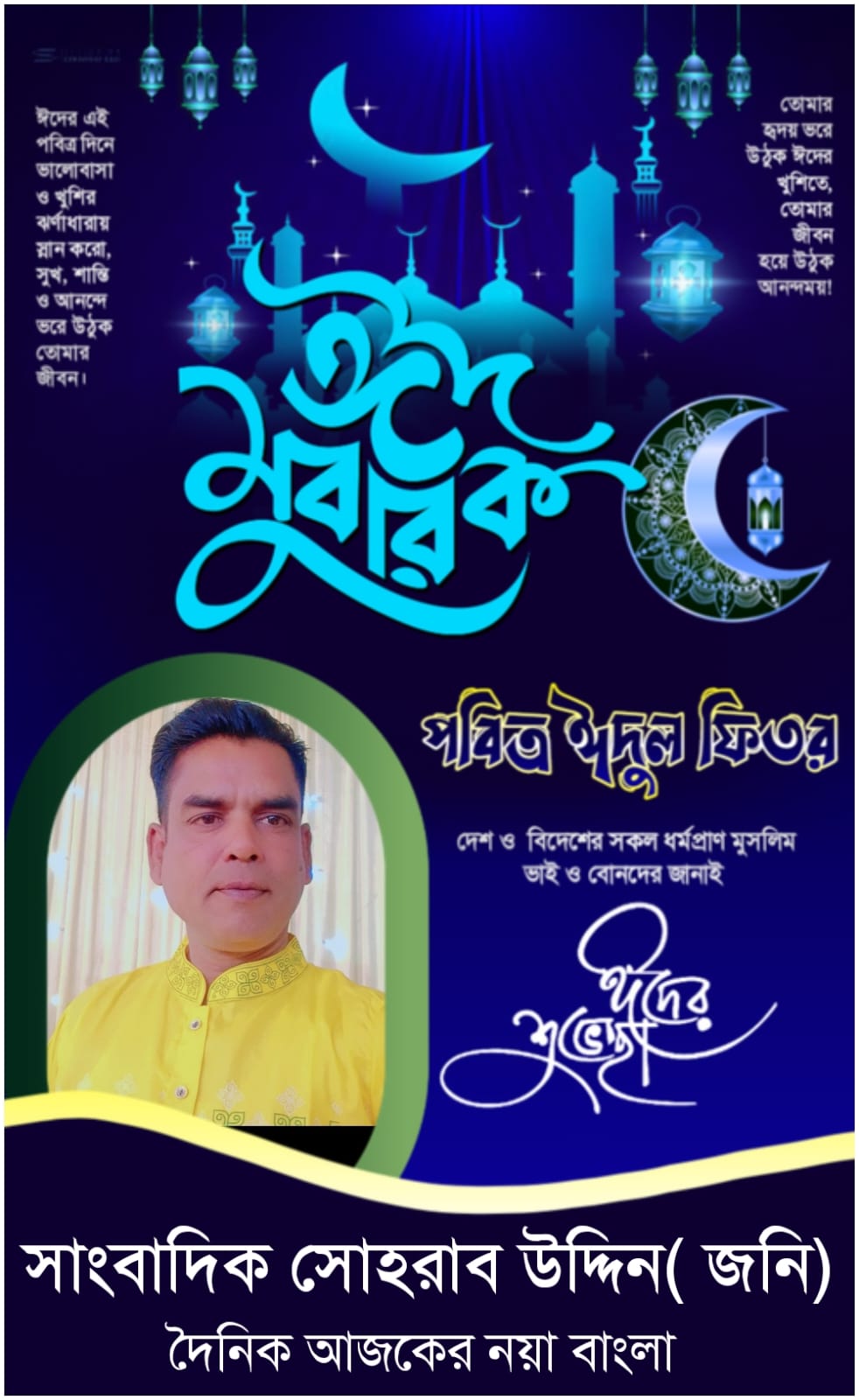 শুভেচ্ছা বার্তায় সাংবাদিক সোহরাব উদ্দিন জনি বলেন সকলের সুস্বাস্থ্য, দীর্ঘায়ু ও মঙ্গল কামনা করেন এবং পবিত্র ঈদুল ফিতরের শিক্ষাকে ধারণ করে একটি সুখী ও বৈষম্যহীন সমাজ গড়ার আহ্বান জানান।