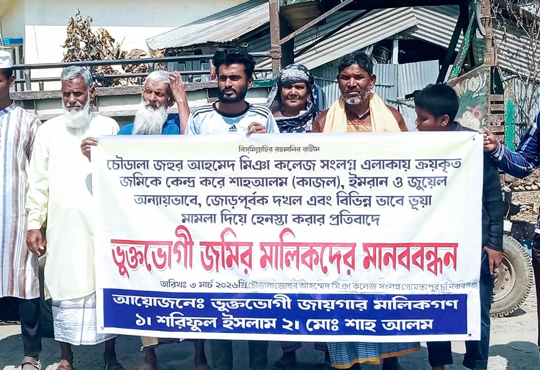 চাঁপাইনবাবগঞ্জের চৌডালায় সেনাবাহিনীর ক্যাপ্টেন পরিচয় দিয়ে জোরপূর্বক জমি দখল ও মিথ্যা মামলা দায়েরের প্রতিবাদে এবং ভূমিদস্যুর বিচারের দাবিতে মানববন্ধন হয়েছে। মঙ্গলবার দুপুরে জেলার গোমস্তাপুর উপজেলার চৌডালা মাদ্রাসা মোড়ে মানববন্ধন করে ভুক্তভোগী জমির মালিক ও এলাকাবাসী।