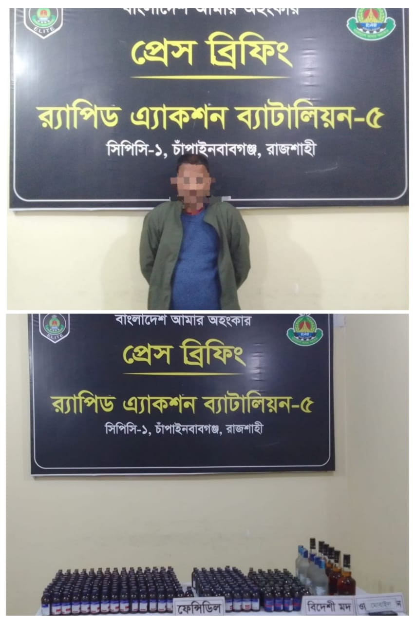 আব্দুল্লাহ আল মুক্তাদির বাঁধন: রাজশাহী প্রতিনিধি: র্যাপিড এ্যাকশন ব্যাটালিয়ন (র্যাব) প্রতিষ্ঠাকালীন সময় থেকেই দেশের সার্বিক আইন শৃঙ্খলা পরিস্থিতি সমুন্নত রাখার লক্ষ্যে সব ধরণের অপরাধ নিয়ন্ত্রণ ও অপরাধীকে আইনের আওতায় নিয়ে আসার ক্ষেত্রে অগ্রণী ভূমিকা পালন করে আসছে।এরই ধারাবাহিকতায় র্যাব-৫, রাজশাহী, সিপিসি-১,চাঁপাইনবাবগঞ্জ শিবগঞ্জ থানাধীন ১০নং মনাকষা ইউপি'র মুন্সিপাড়া হতে ধৃত আসামী মোঃ রিপন (৩২) কে তার বসতবাড়ির উত্তর পার্শ্বে নেপিয়ার ঘাস চাষকৃত জমির ভিতর বিশেষ কায়দায় লুকিয়ে রাখা ২৯৫ বোতল ফেনসিডিল ও ১২ বোতল বিদেশী মদসহ আটক করা হয়। ধৃত আসামী ও উদ্ধারকৃত আলামত পরবর্তী আইনানুগ ব্যবস্থা গ্রহণের জন্য শিবগঞ্জ থানায় হস্তান্তর করা হয়। ঘটনা সূত্রে জানা যায়, ১৩ জানুয়ারি ২০২৬ ইং তারিখ ১০:২০ ঘটিকার সময় র্যাব-৫, সিপিসি-১ এর একটি আভযানিক টহল দল চাঁপাইনবাবগঞ্জ জেলার সদর থানা সকল এলাকায় নিয়মিত টহল ও মাদকদ্রব্য উদ্ধার অভিযান পরিচালনা উদ্দেশ্যে বাহির হয়। অভিযান পরিচালনার ধারাবাহিকতায় গোপন তথ্যের ভিত্তিতে জানতে পারে যে,চাঁপাইনবাবগঞ্জ জেলার শিবগঞ্জ থানাধীন ১০নং মনাকষা ইউপির মুন্সিপাড়ায় মাদক কারবারী মোঃ রিপন এর বসতবাড়িতে অবৈধ মাদক ক্রয়-বিক্রয় হচ্ছে। উক্ত সংবাদের ভিত্তিতে আভিযানিক টহল দল চাঁপাইনবাবগঞ্জ জেলার শিবগঞ্জ থানাধীন ১০নং মনাকষা ইউপি'র মুন্সিপাড়া গ্রামস্থ মোঃ মঞ্জুর হোসেন এর ছেলে মাদক কারবারী মোঃ রিপন (৩২) কে তার নিজ বসতবাড়ি হতে ১২:১০ ঘটিকায় আটক করা হয়। পরবর্তীতে আসামী রিপন এর স্বীকারোক্তি ও নিজ হাতে বের করে দেওয়া মতে বসতবাড়ির উত্তর পার্শ্বে গোয়াল ঘরের পিছনে তার বর্গাকৃত নেপিয়ার ঘাসের জমিতে বিশেষ কায়দায় ছাই ও খড় দিয়ে ঢাকা মাটির নীচে দুইটি আলাদা গর্তে ০২টি নীল রংয়ের প্লাস্টিকের ড্রামের ভিতরে রক্ষিত ২৯৫ বোতল ফেনসিডিল,০৬ বোতল MAGIC MOMENTS (বিদেশী মদ) এবং ০৬ বোতল SEAGRAMS BLENDERS (বিদেশী মদ) অবৈধ মাদকদ্রব্য উদ্ধার করা হয়। এ সময় উপস্থিত ছিলেন প্রেস ও ইলেকট্রনিক মিডিয়ার সাংবাদিকবৃন্দরা।