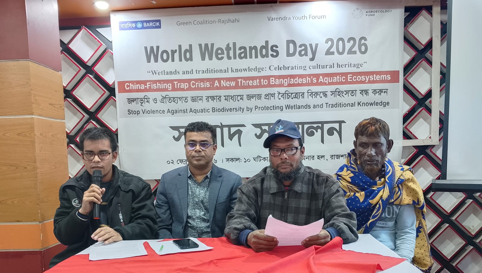 - চায়না থেকে আমদানি করা মাছ ধরার ফাঁদ, কৃত্রিম হানি ট্র্যাপ ও রাসায়নিক আকর্ষণকারীর নির্বিচার ব্যবহারে বরেন্দ্র অঞ্চলসহ দেশের জলাভূমির প্রাণবৈচিত্র্য মারাত্মক হুমকির মুখে পড়েছে। এ অবস্থায় অবিলম্বে কার্যকর নীতিগত ও আইনগত পদক্ষেপ গ্রহণের দাবি জানিয়ে সংবাদ সম্মেলন করা হয়েছে। সোমবার সকালে নগরীর এসকে সেমিনার হলে বাংলাদেশ রিসোর্স সেন্টার, গ্রিন কোয়ালিশন-রাজশাহী ও বরেন্দ্র ইয়ুথ ফোরামের উদ্যোগে আয়োজিত এক সংবাদ সম্মেলনে এসব উদ্বেগের কথা জানানো হয়।