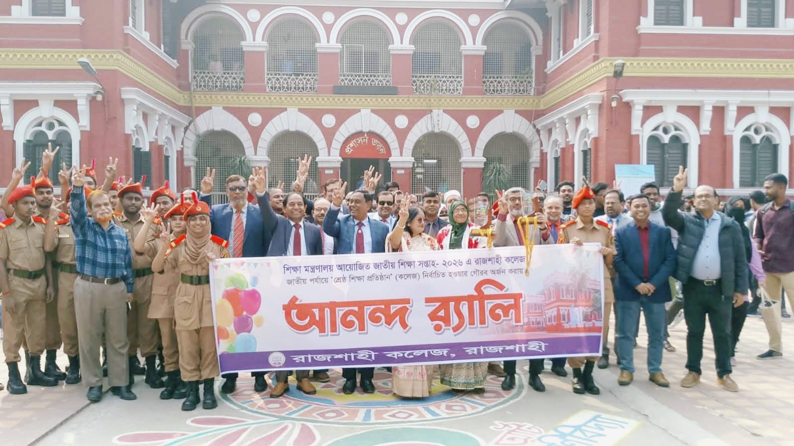 শিক্ষা মন্ত্রণালয় আয়োজিত জাতীয় শিক্ষা সপ্তাহ-২০২৬ আবারও রাজশাহী কলেজ শ্রেষ্ঠ শিক্ষাপ্রতিষ্ঠানের গৌরব অর্জন করায় বর্ণাঢ্য আনন্দ র্যালি অনুষ্ঠিত হয়েছে। বুধবার (২১ জানুয়ারি) বেলা সাড়ে ১১টায় রাজশাহী কলেজ প্রশাসন ভবনের সামনে থেকে শুরু হয়ে জাদুঘর মোড় হয়ে গুরুত্বপূর্ণ সড়কমোড় সমূহ প্রদক্ষিণ করে পুনরায় কলেজের প্রশাসন ভবনের সামনে এসে শেষ হয়।