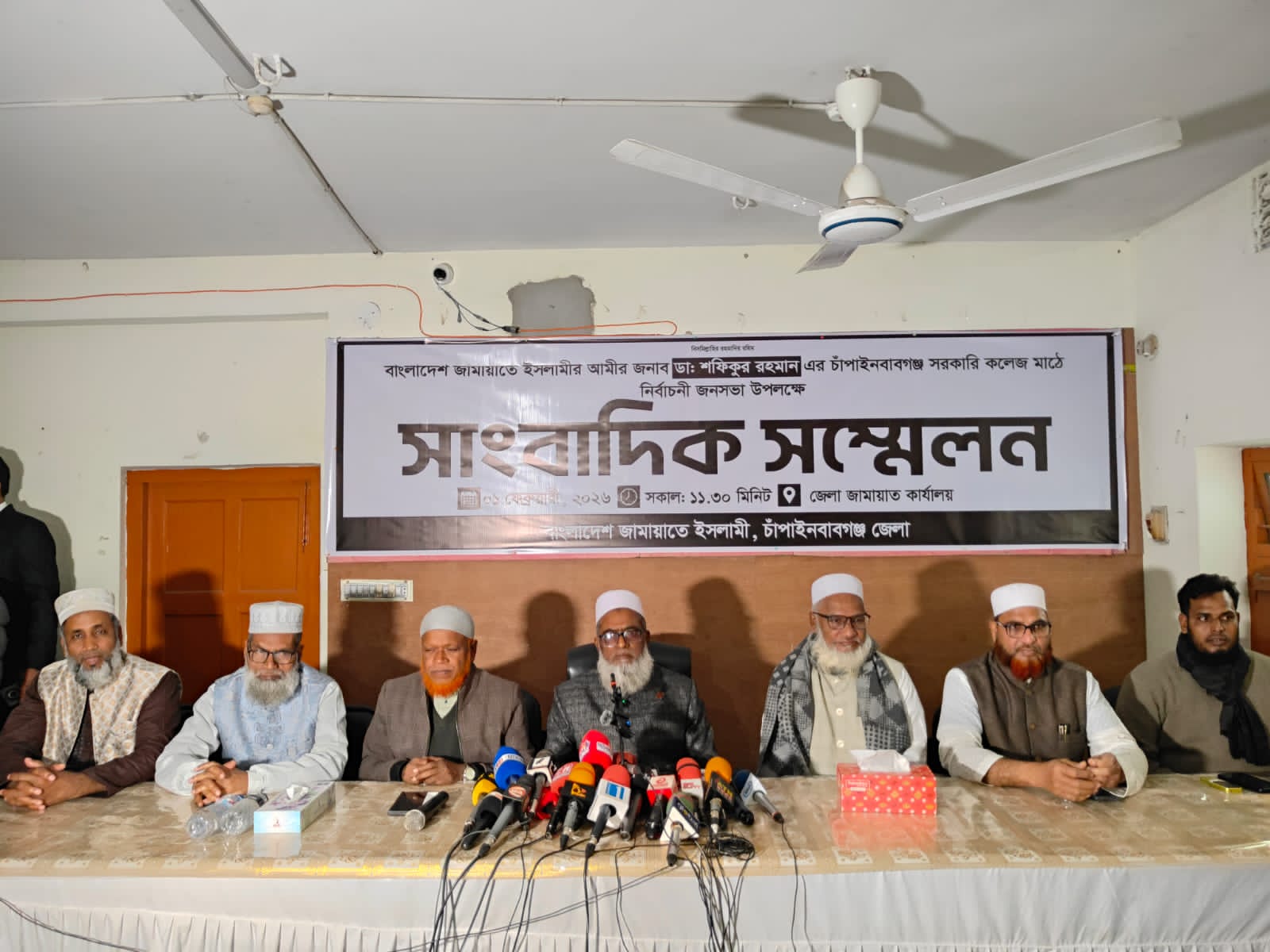 সাদ হোসেন মুজাহিদ, চাঁপাইনবাবগঞ্জ জেলা প্রতিনিধি বাংলাদেশ জামায়াতে ইসলামীর আমীর জনাব ডা. শফিকুল রহমানের চাঁপাইনবাবগঞ্জ সরকারি কলেজ মাঠে অনুষ্ঠিতব্য নির্বাচনী জনসভা উপলক্ষে সাংবাদিক সম্মেলন অনুষ্ঠিত হয়েছে। রবিবার (১ ফেব্রুয়ারি) সকাল সাড়ে ১১টায় জেলা জামায়াতে ইসলামীর কার্যালয়ের কনফারেন্স রুমে এ সাংবাদিক সম্মেলনের আয়োজন করা হয়। সাংবাদিক সম্মেলনে জানানো হয়, আগামী ১২ ফেব্রুয়ারি অনুষ্ঠিতব্য ত্রয়োদশ জাতীয় সংসদ নির্বাচনকে সামনে রেখে বাংলাদেশ জামায়াতে ইসলামী ‘জুলাই সনদ’ বাস্তবায়ন, দুর্নীতি ও চাঁদাবাজমুক্ত দেশ গঠন, যুবকদের কর্মসংস্থান সৃষ্টি এবং একটি বৈষম্যমুক্ত কল্যাণরাষ্ট্র প্রতিষ্ঠার লক্ষ্যে নির্বাচনে অংশগ্রহণ করেছে। নেতৃবৃন্দ বলেন, আল্লাহর সাহায্য ও জনগণের ম্যান্ডেট নিয়ে বাংলাদেশ জামায়াতে ইসলামী আগামী দিনে সরকার গঠন করতে চায়। এ সময় তারা আরও বলেন, একটি অবাধ, সুষ্ঠু ও নিরপেক্ষ নির্বাচন নিশ্চিত করতে সিভিল প্রশাসন, পুলিশ প্রশাসন, সেনাবাহিনী, র্যাব, গোয়েন্দা বিভাগ, আইনজীবী, সাংবাদিকসহ সমাজের সর্বস্তরের মানুষের সহযোগিতা প্রত্যাশা করে বাংলাদেশ জামায়াতে ইসলামী।