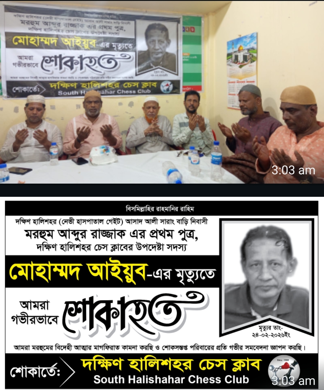 নগরীর ৩৯ নং ওয়ার্ডস্থ"দক্ষিণ হালিশহর চেস ক্লাবের সম্মানিত উপদেষ্টা সদস্য ও বিশিষ্ট সমাজসেবক মোঃ আইয়ুব (৫৫) এর মৃত্যুতে এক শোকসভা ও দোয়া মাহফিল ২৬ ফেব্রুয়ারি, বৃহস্পতিবার রাতে অস্থায়ী কার্যালয়ে সম্পন্ন হয়েছে।