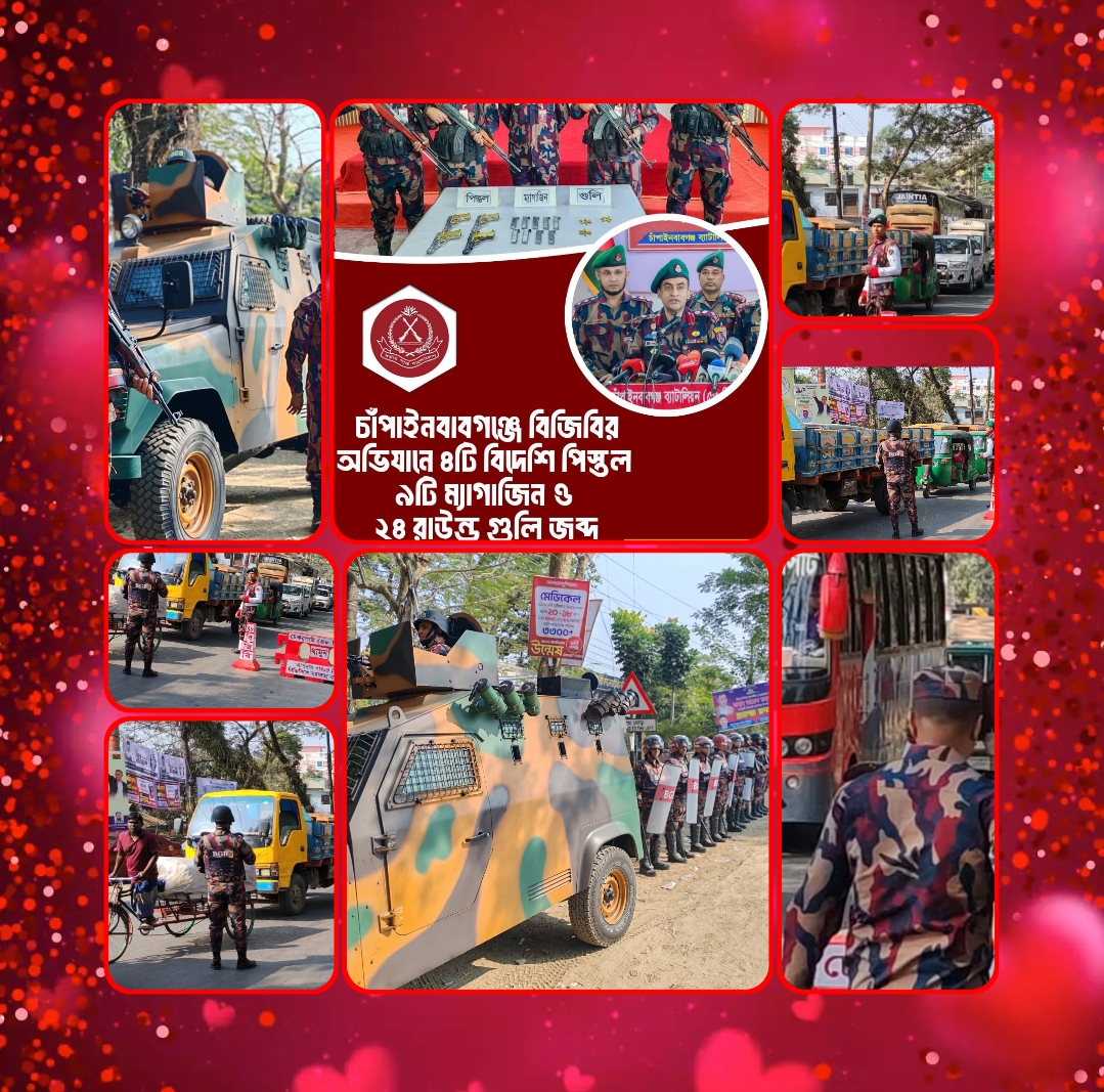 নিশ্ছিদ্র নিরাপত্তা! জেলা জুড়ে ৫৩ বিজিবির জমকালো মহড়া! অনুসন্ধানিক প্রতিবেদক, চাঁপাইনবাবগঞ্জ 'আসন্ন দ্বাদশ জাতীয় সংসদ নির্বাচনকে কেন্দ্র করে জনমনে স্বস্তি ফেরাতে এবং আইনশৃঙ্খলা পরিস্থিতি নিয়ন্ত্রণে রাখতে চাঁপাইনবাবগঞ্জ জেলা জুড়ে ব্যাপক মহড়া পরিচালনা করেছে বর্ডার গার্ড বাংলাদেশ (৫৩ বিজিবি)। বিজিবির এই বিশেষ টহল ও মহড়া সাধারণ মানুষের মধ্যে নিরাপত্তার নতুন এক বার্তা পৌঁছে দিয়েছে। নিরাপত্তার চাদরে ঢাকা! চাঁপাইনবাবগঞ্জের জেলা শহর ও ইউনিয়নসহ পর্যবেক্ষণে ৫৩ বিজিবি ব্যাটেলিয়ান! আজ সকাল থেকেই চাঁপাইনবাবগঞ্জের প্রধান প্রধান সড়কগুলোতে বিজিবির সাঁজোয়া যান ও বিশেষায়িত দলের মহড়া লক্ষ্য করা যায়। বিশেষ করে শহরের গুরুত্বপূর্ণ মোড়, জনবহুল এলাকা এবং স্পর্শকাতর কেন্দ্রগুলোতে বিজিবির অবস্থান ছিল চোখে পড়ার মতো।মহড়ার প্রধান আকর্ষণসমূহ! ডগ স্কোয়াডের উপস্থিতি"- রেলওয়ে স্টেশনসহ গুরুত্বপূর্ণ স্থাপনাগুলোতে বিজিবির দক্ষ 'ডগ স্কোয়াড' দিয়ে তল্লাশি চালানো হয়। এটি যেকোনো ধরণের অপ্রীতিকর ঘটনা রোধে একটি শক্তিশালী পদক্ষেপ। যৌথ চেকপোস্ট! বিজিবির পাশাপাশি পুলিশ সদস্যদের সমন্বয়ে বিভিন্ন পয়েন্টে মোটরসাইকেল ও যানবাহনের নথিপত্র এবং আরোহীদের তল্লাশি করা হয়।