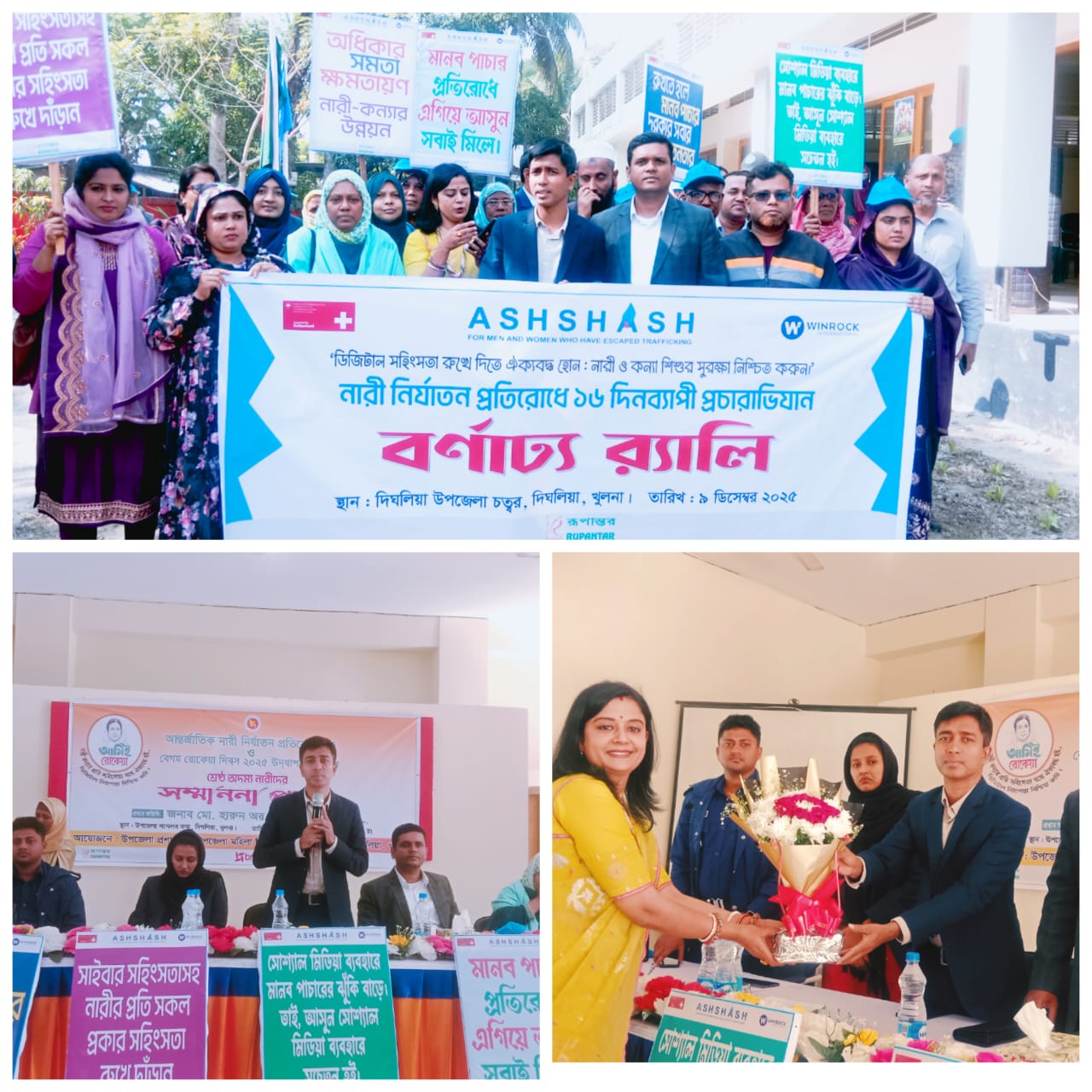 খুলনার দিঘলিয়া উপজেলা পরিষদ মিলনায়তন কক্ষে আন্তর্জাতিক নারী নির্যাতন প্রতিরোধ পক্ষ ও বেগম রোকেয়া দিবস–২০২৫ উপলক্ষে শ্রেষ্ঠ অদম্য নারীদের সম্মাননা প্রদান, আলোচনা সভা ও র্যালি অনুষ্ঠিত হয়েছে। আজ মঙ্গলবার সকালে অনুষ্ঠিত এ অনুষ্ঠানে প্রধান অতিথি হিসেবে উপস্থিত ছিলেন দিঘলিয়া উপজেলা নির্বাহী অফিসার জনাব মো. হারুন অর রশিদ।