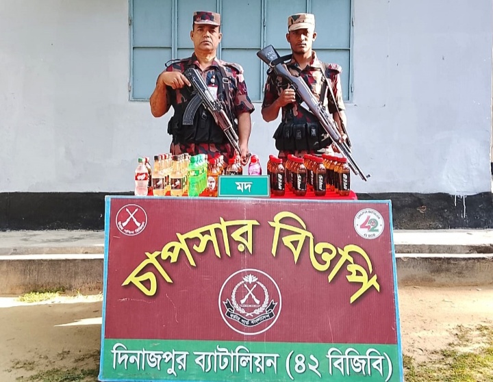 এই ধারাবাহিক অভিযানের অংশ হিসেবে প্রাপ্ত সুনির্দিষ্ট গোয়েন্দা তথ্যের ভিত্তিতে গত ০১ এপ্রিল ২০২৬, রাত ২৩১৫ ঘটিকায়, দিনাজপুর ব্যাটালিয়ন (৪২ বিজিবি) এর অধীনস্থ চাপসার বিওপি’র একটি টহল দল চোরাচালান বিরোধী বিশেষ অভিযান পরিচালনা করে। অভিযানে ঠাকুরগাঁও জেলার হরিপুর উপজেলাধীন সীমান্ত পিলার ৩৪৬/১৬-আর হতে আনুমানিক ০১ কিঃমিঃ বাংলাদেশের অভ্যন্তরে গ্রামপুকুর নামক স্থান হতে মালিকবিহীন অবস্থায় ৬২ বোতল দেশি মদ উদ্ধার করা হয়।