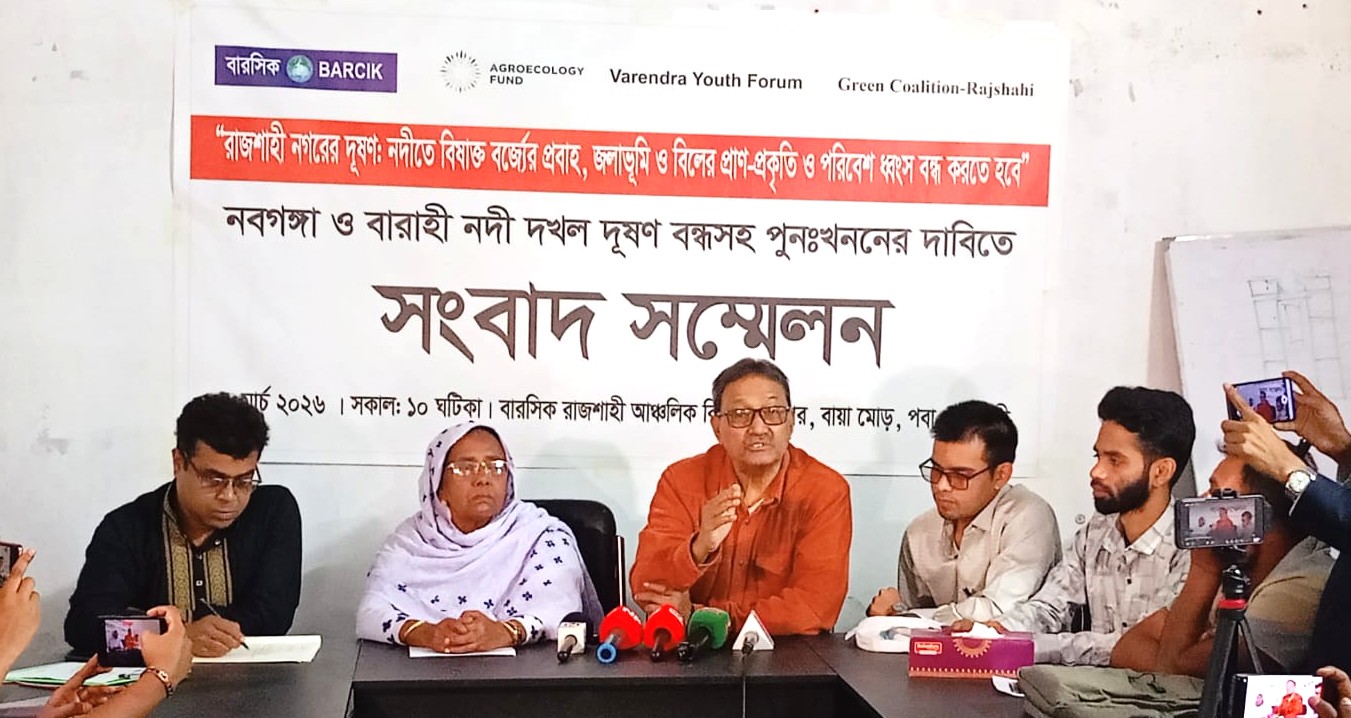 নবগঙ্গা ও বারাহী নদী পুনঃখননের দাবিতে সংবাদ সম্মেলন রাজশাহীর নবগঙ্গা ও বারাহী নদী দখল–দূষণ বন্ধ ও পুনঃখননের দাবিতে সংবাদ সম্মেলন অনুষ্ঠিত হয়েছে। রোববার বেলা ১১ টার দিকে পবা উপজেলার বায়া বারসিক রাজশাহী আঞ্চলিক রিসোর্স সেন্টারে আয়োজিত সংবাদ সম্মেলনে এ দাবি তুলে ধরে গ্রিন কোয়ালিশন, বরেন্দ্র ইয়ুথ ফোরাম ও বারসিক। সংবাদ সম্মেলনে বক্তারা বলেন, দীর্ঘদিন মাঠপর্যায়ে পর্যবেক্ষণ এবং স্থানীয় কৃষক, জেলে ও অধিবাসীদের অভিজ্ঞতা সংগ্রহের ভিত্তিতে তারা এই উদ্বেগজনক পরিস্থিতি চিহ্নিত করেছেন। তাদের দাবি, নগরের বিভিন্ন ড্রেন ও নালার মাধ্যমে প্রতিদিন বিপুল পরিমাণ অপরিশোধিত তরল বর্জ্য সরাসরি নদী ও খালে প্রবাহিত হচ্ছে। প্লাস্টিক ও অপচনশীল বিষাক্ত পদার্থ পরিবেশে মারাত্মক সংকট তৈরি করছে। তারা জানান, পদ্মা নদী-এর প্রবাহ থেকে উৎসারিত স্বরমঙ্গলা, বারাহী ও নবগঙ্গা নদীসহ একাধিক নদী ও খাল এখন কার্যত ড্রেনে পরিণত হয়েছে। বিভিন্ন উন্নয়ন কর্মকাণ্ডের নামে এসব জলাধারের প্রাকৃতিক প্রবাহ বাধাগ্রস্ত হয়েছে। বর্তমানে এসব নদীর পানি কালচে, দুর্গন্ধযুক্ত এবং প্রাণবৈচিত্র্যহীন হয়ে পড়েছে। নদীর তলদেশে পলি ও প্লাস্টিক জমে মাছের প্রজনন ক্ষেত্র ধ্বংস হচ্ছে। এতে স্থানীয় জেলেরা আয় হারাচ্ছেন এবং মুক্ত জলাশয় থেকে নিরাপদ আমিষের সরবরাহ ব্যাহত হচ্ছে।
