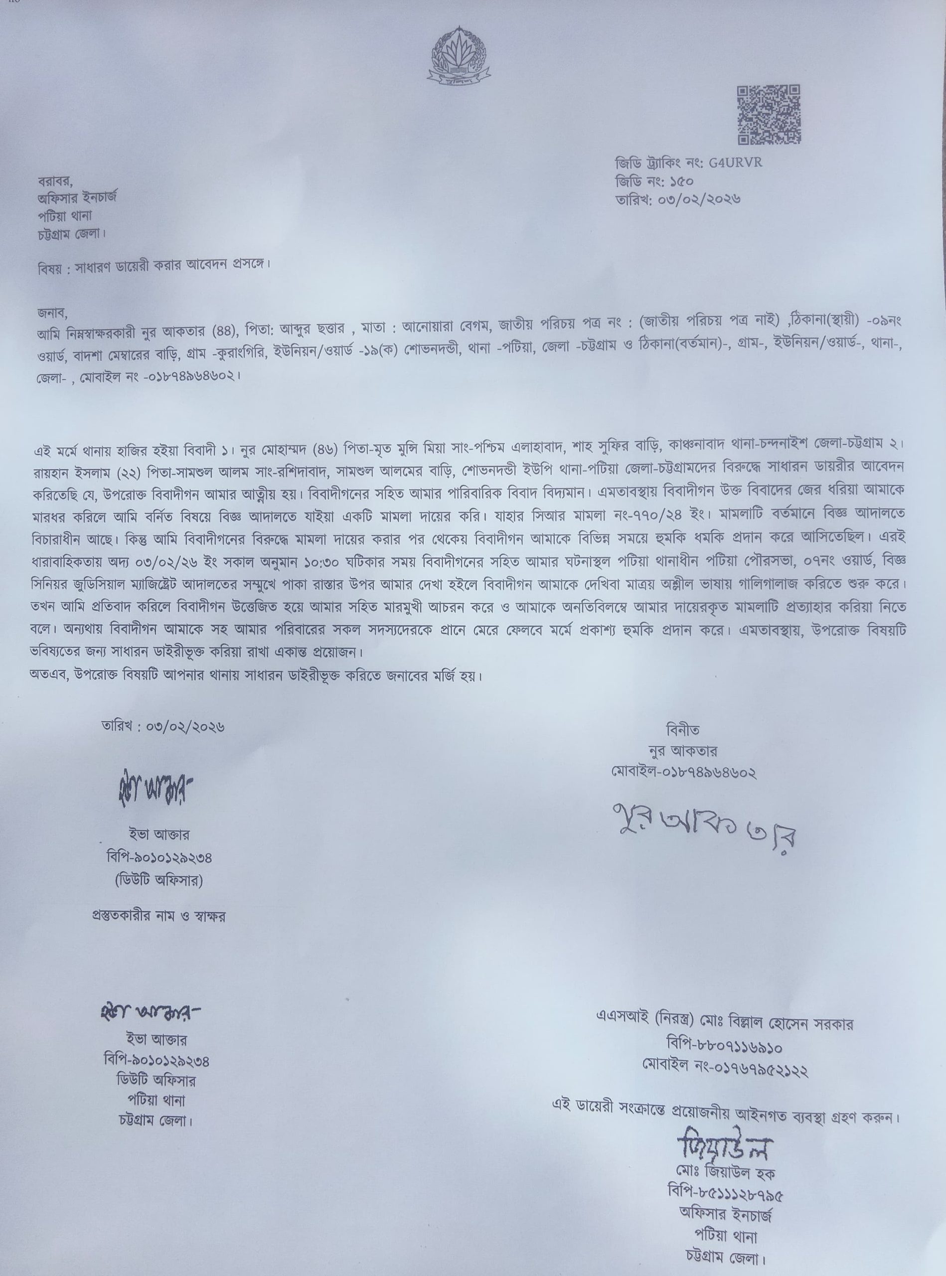 এর ধারাবাহিকতায় ০৩/০২/২৬ ইং সকাল সাড়ে ১০ টার সময় বিবাদীগনের সহিত আমার পটিয়া থানাধীন পৌরসভা, ০৭নং ওয়ার্ড, বিজ্ঞ সিনিয়র জুডিসিয়াল ম্যাজিষ্ট্রেট আদালতের সম্মুখে পাকা রাস্তার উপর দেখা হলে বিবাদীগন