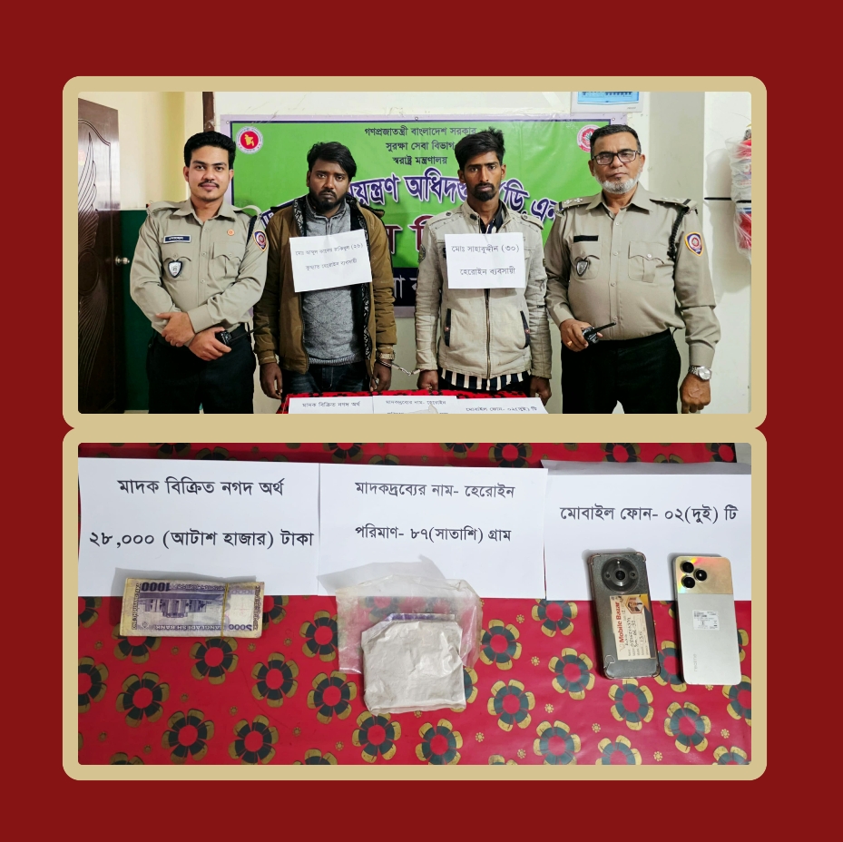 পটুয়াখালীতে নির্বাচনকালীন বিশেষ অভিযানে ৮৭ গ্রাম হেরোইনসহ আটক ২