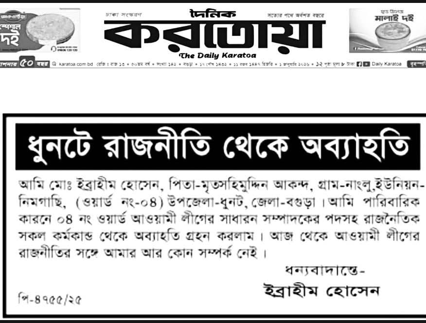 বগুড়ার ধুনট উপজেলার নিমগাছি ইউনিয়নে পত্রিকায় বিজ্ঞাপন প্রকাশের মাধ্যমে ওয়ার্ড আওয়ামী লীগের এক নেতার পদত্যাগের ঘটনা ঘটেছে। পারিবারিক কারণ দেখিয়ে তিনি দলীয় পদসহ আওয়ামী লীগের রাজনীতি ও সব ধরনের রাজনৈতিক কর্মকাণ্ড থেকে সরে দাঁড়ানোর ঘোষণা দিয়েছেন।