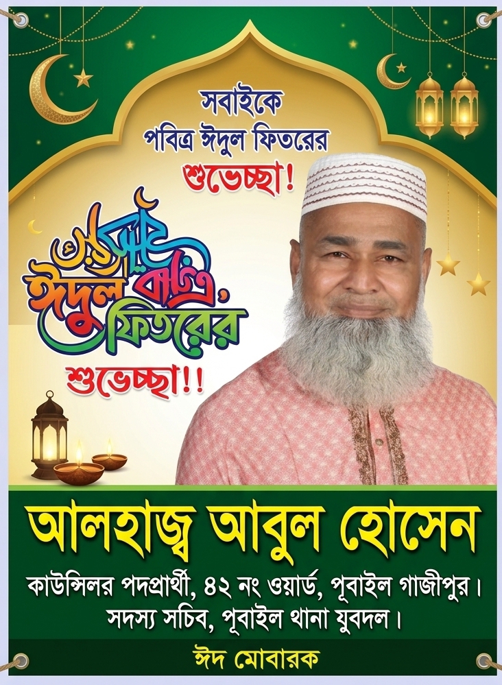পবিত্র ঈদুল ফিতর উপলক্ষে পূবাইল থানার সর্বস্তরের জনগণকে আন্তরিক শুভেচ্ছা ও ঈদ মোবারক জানিয়েছেন পূবাইল থানা যুবদলের সদস্য সচিব এবং আসন্ন সিটি কর্পোরেশন নির্বাচনে কাউন্সিলর পদপ্রার্থী আলহাজ্ব আবুল হোসেন।