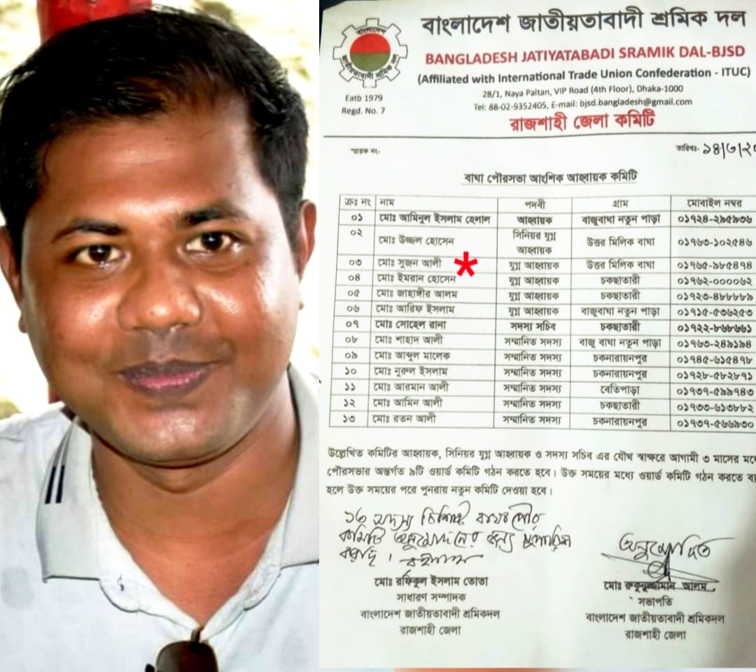 মেধা, দক্ষতা ,পরিশ্রম ও কর্মদক্ষতার ভিত্তিতে এগিয়ে যাওয়ার পথকে সুগম করেছেন সুজন ।সাবেক জিয়া মঞ্চ রাজশাহী মহানগরের সদস্য সচিব সুজন এখন বাঘা পৌর শ্রমিক দলের যুগ্ম আহ্বায়ক। তার অক্লান্ত পরিশ্রম ,দক্ষতা এবং মেধাই এগিয়ে নিয়ে গিয়েছে তাকে। দেশের রাজনৈতিক অঙ্গনে বড় ভূমিকা রাখতে চান তিনি ।নবগঠিত বাঘা পৌর শ্রমিক দলের যুগ্ম আহবায়ক নির্বাচিত হয়েছেন মোঃ সুজন আলী।এই কমিটির সম্পর্কে এবং মোঃ সুজন আলীর পদায়নের জন্য তার সঙ্গে কথা বললে তিনি জানান প্রথমেই তিনি রাষ্ট্রনায়ক ও বাংলাদেশের প্রধানমন্ত্রী তারেক রহমান কে ধন্যবাদ জানান ।সেই সাথে বিশেষ ভাবে জেলা শ্রমিক দলের সভাপতি মোঃ রোকুনুজ্জামান আলম কে অশেষ ধন্যবাদ ও শ্রদ্ধা জ্ঞাপন করেন। আরো ধন্যবাদ জানান জেলা শ্রমিক দলের সহ-সভাপতি ওয়াদুদ -উল মোঃ তাকাদ্দাছ কাজল ,সমন্বয়ক জিল্লুর রহমান ও জেলা শ্রমিক দলের সাধারণ সম্পাদক রফিকুল ইসলাম তোতাকে। বিএনপি'র মূল সংগঠনের নেতৃত্ব দিতে পেরে নিজেকে সৌভাগ্যবান মনে করেন তিনি। তিনি আরো আশা ব্যক্ত করেন, সুযোগ পেলে তার যোগ্যতা মেধা ও দক্ষতা দিয়ে তিনি জেলা দলের গুরুত্বপূর্ণ পদে আসীন হয়ে জনগণের জন্য কাজ করতে চান।