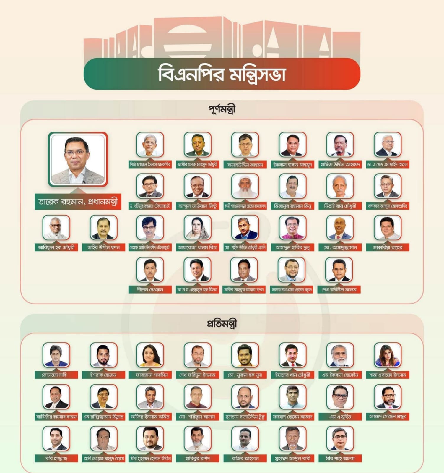 নিরঙ্কুশ বিজয়ের পর সরকার গঠনের আনুষ্ঠানিক প্রক্রিয়ার অংশ হিসেবে আজ মঙ্গলবার (১৭ ফেব্রুয়ারি) বিকেলে শপথ নিতে যাচ্ছেন বিএনপি নেতৃত্বাধীন নতুন মন্ত্রিসভা।বিএনপি চেয়ারম্যান তারেক রহমান-এর নেতৃত্বে গঠিত ৫০ সদস্যের এই মন্ত্রিসভায় থাকছেন ২৫ জন পূর্ণমন্ত্রী ও ২৪ জন প্রতিমন্ত্রী। তবে ঘোষিত তালিকায় গুরুত্বপূর্ণ বিভাগ খুলনা থেকে কাউকে স্থান না দেওয়ায় রাজনৈতিক অঙ্গনে তাৎপর্যপূর্ণ আলোচনা শুরু হয়েছে।এর আগে সকালে ত্রয়োদশ জাতীয় সংসদ নির্বাচনে বিজয়ী সংসদ সদস্যরা শপথ গ্রহণ করেন। পরবর্তী ধাপে বিকেলে রাজধানীর জাতীয় সংসদ ভবন-এর দক্ষিণ প্লাজায় নতুন মন্ত্রিসভার সদস্যদের শপথ অনুষ্ঠান অনুষ্ঠিত হওয়ার কথা রয়েছে।ঘোষিত তালিকা অনুযায়ী, মির্জা ফখরুল ইসলাম আলমগীর, আমীর খসরু মাহমুদ চৌধুরী, সালাহউদ্দিন আহমদ, ইকবাল হাসান মাহমুদ (টুকু), মেজর (অব.) হাফিজ উদ্দিন আহমদ, এ জেড এম জাহিদ হোসেন, আবদুল আউয়াল মিন্টু, কাজী শাহ মোফাজ্জল হোসাইন কায়কোবাদ, আ ন ম এহছানুল হক মিলনসহ ২৫ জন পূর্ণমন্ত্রী হিসেবে শপথ নেবেন।একইসঙ্গে শামা ওবায়েদ ইসলাম, কায়সার কামাল, জোনায়েদ সাকি, ইশরাক হোসেন, ববি হাজ্জাজসহ ২৪ জন প্রতিমন্ত্রী শপথ গ্রহণ করবেন।দলীয় সূত্র জানিয়েছে, রাজনৈতিক নেতৃত্বের পাশাপাশি কয়েকজন টেকনোক্র্যাটকেও মন্ত্রিসভায় অন্তর্ভুক্ত করা হয়েছে, যাতে নীতিনির্ধারণ ও প্রশাসনিক কার্যক্রমে দক্ষতা বাড়ানো যায়। অন্তর্বর্তী সরকারের নিরাপত্তা উপদেষ্টা খলিলুর রহমানসহ কয়েকজন টেকনোক্র্যাট পূর্ণমন্ত্রী ও প্রতিমন্ত্রী হিসেবে থাকছেন।