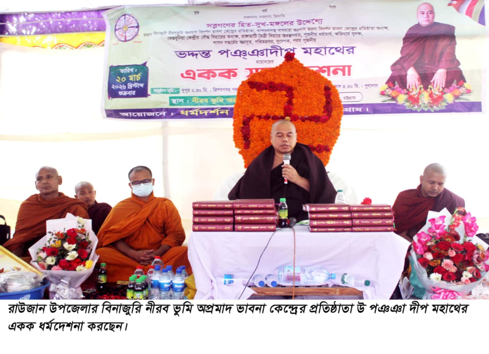 শুক্রবার ২০ মার্চ ২০২৬ রাউজান উপজেলার মধ্যম বিনাজুরী নীরব ভুমি অপ্রমাদ বিদর্শন ভাবনা কেন্দ্রে এক ধর্মসম্মেলন ও একক সদ্ধর্ম দেশনা শিক্ষক মিঠুন বড়ুয়ার সঞ্চালনায় অনুষ্ঠিত হয়েছে। প্রতিষ্ঠানের প্রতিষ্ঠাতা আন্তর্জাতিক খ্যাতিসম্পন্ন বিদর্শানার্য, অভিধর্ম কথিক, সুদেশক বৌদ্ধ সাংঘিক ব্যাক্তিত্ব ভদন্ত পঞ্ঞাদীপ মহাথের একক সদ্ধর্মদেশনা প্রদান করেন।