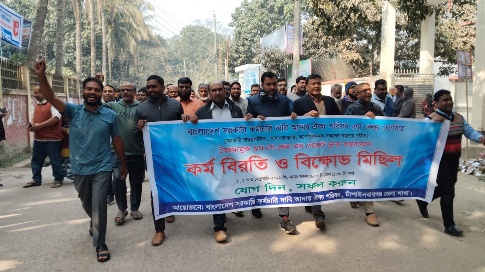 জাতীয় বেতন কমিশনের সুপারিশকৃত বৈষম্যহীন এক দফা দাবি অনুযায়ী ৯ম পে-স্কেলের গেজেট জারির দাবিতে চাঁপাইনবাবগঞ্জে অবস্থান ও বিক্ষোভ কর্মসূচি পালন করেছে বাংলাদেশ সরকারি কর্মচারী দাবি আদায় ঐক্য পরিষদ। আজ মঙ্গলবার (৩ ফেব্রুয়ারি) সকাল ১০টায় চাঁপাইনবাবগঞ্জ জেলা প্রশাসক কার্যালয় চত্বর থেকে একটি বিশাল মিছিল বের করা হয়। মিছিলটি শহরের প্রধান প্রধান সড়ক প্রদক্ষিণ শেষে আবারও জেলা প্রশাসক কার্যালয় চত্বরে গিয়ে শেষ হয়। সেখানে অবস্থান কর্মসূচির পাশাপাশি কর্মবিরতি পালন করেন কর্মচারীরা। এ কর্মসূচিতে অংশগ্রহণ করেন চাঁপাইনবাবগঞ্জ জেলা শাখার বিচার বিভাগীয় কর্মচারী এসোসিয়েশন ও কালেক্টরেট কর্মচারী সমিতির সদস্যরা। অবস্থান ও বিক্ষোভে বিচার বিভাগীয় কর্মচারী এসোসিয়েশনের সভাপতি মোঃ ওবাইদুল রহমান, সাধারণ সম্পাদক মোঃ মতিউর রহমান, সাংগঠনিক সম্পাদক সেলিম মাহমুদসহ সংগঠনের অন্যান্য নেতৃবৃন্দ উপস্থিত ছিলেন।