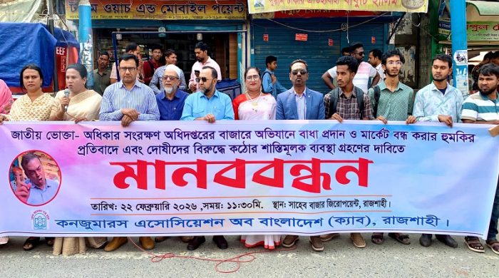 প্রিয়জন ডেস্কঃ জাতীয় ভোক্তা অধিকার সংরক্ষণ অধিদপ্তরের বাজারে অভিযানে বাধা প্রদান ও মার্কেট বন্ধ করার হুমকির প্রতিবাদে এবং দোষীদের বিরুদ্ধে কঠোর শাস্তিমূলক ব্যবস্থা গ্রহণের দাবিতে রাজশাহীতে মানববন্ধন করেছে কনজ্যুমার্স অ্যাসোসিয়েশন অব বাংলাদেশ (ক্যাব)।আজ (রোববার, ২২ ফেব্রুয়ারি) সকাল ১১টায় নগরীর সাহেব বাজার জিরো পয়েন্টে তারা এ মানববন্ধন করেন। মানববন্ধনে রাজশাহীর ক্যাবের সদস্যরা উপস্থিত ছিলেন।মানববন্ধনে বক্তারা জানান, রমজান মাসে অন্যান্য দেশে নিত্যপণ্যসহ সবকিছুর দাম কমে গেলেও বাংলাদেশে দাম বাড়তেই থাকে। ফলে এই মাসটা সাধারণ মানুষের ক্রয়ক্ষমতার নাগালের বাইরে চলে যায়।তারা আরও জানান, এইসব অসাধু ব্যবসায়ীর সিন্ডিকেট ভাঙ্গতে জাতীয় ভোক্তা অধিকার সংরক্ষণ অধিদপ্তরের নির্বাহী ম্যাজিস্ট্রেটরা অভিযান চালায় তখন তাদের নানান ভাবে হয়রানি করা হয়।এসময় যারা ভোক্তা অধিকার সংরক্ষণ অধিদপ্তরের নির্বাহী ম্যাজিস্ট্রেটদের বাধা প্রদান ও মার্কেট বন্ধ করার হুমকি দিয়েছেন তাদের বিরুদ্ধে কঠোর শাস্তিমূলক ব্যবস্থা গ্রহণ করতে হবে বলে দাবি জানান।