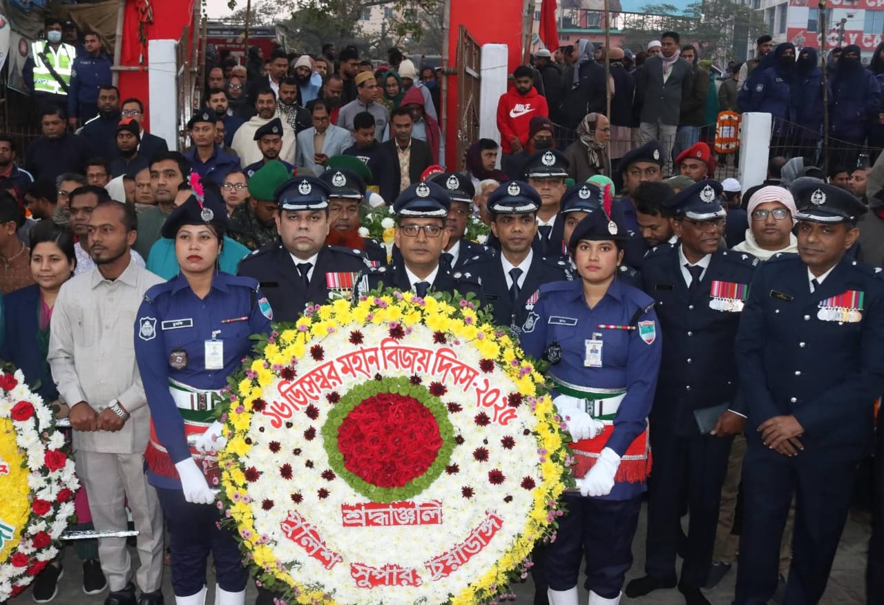 অদ্য ১৬ ডিসেম্বর ২০২৫ইং সকাল ০৬:৩০ ঘটিকায় ১৯৭১ সালে মহান মুক্তিযুদ্ধে অংশগ্রহণকারী দেশের তরে অকাতরে জীবন উৎসর্গকারী সকল শহীদদের স্মরণে শহীদ স্মৃতিস্তম্ভে সূর্যোদয়ের সাথে সাথে পুষ্পস্তবক অর্পণ করে দেশের জন্য জীবন উৎসর্গকারী শহীদ মুক্তিযোদ্ধাদের প্রতি জেলা পুলিশ, চুয়াডাঙ্গা'র পক্ষে গভীর শ্রদ্ধা নিবেদন করেন পুলিশ সুপার, মোহাম্মদ মনিরুল ইসলাম