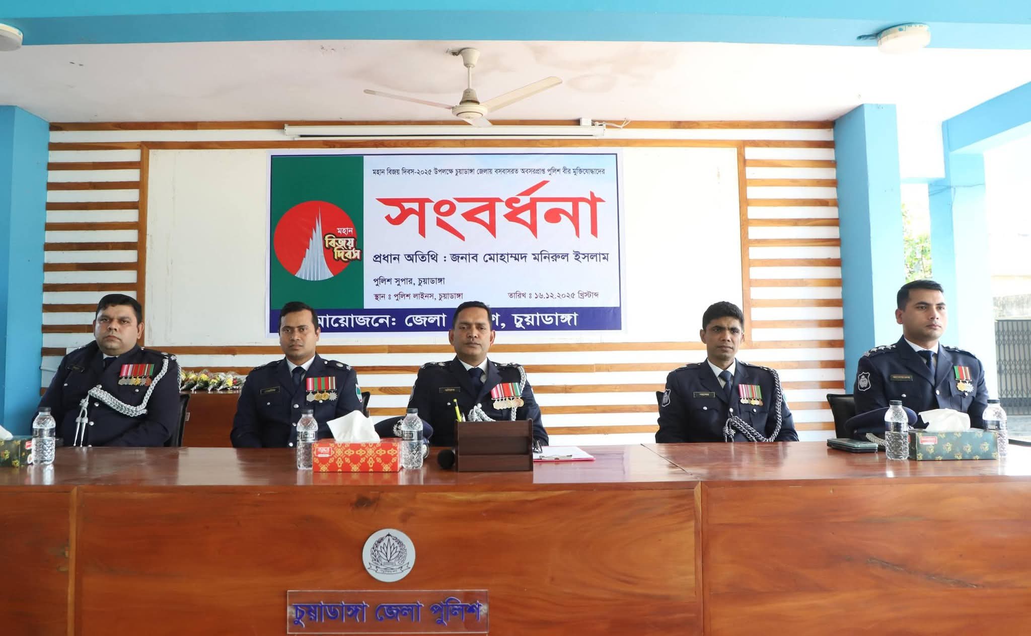 অদ্য ১৬ ডিসেম্বর ২০২৫ইং বেলা ০১:০০ ঘটিকায় মহান বিজয় দিবস-২০২৫ উদযাপন উপলক্ষে চুয়াডাঙ্গা জেলায় বসবাসরত ১৮জন অকুতোভয় পুলিশ বীর মুক্তিযোদ্ধাগনদের শুভেচ্ছা, উপহারসহ সংবর্ধনা প্রদান করেন চুয়াডাঙ্গা পুলিশ সুপার মোহাম্মদ মনিরুল ইসলাম,