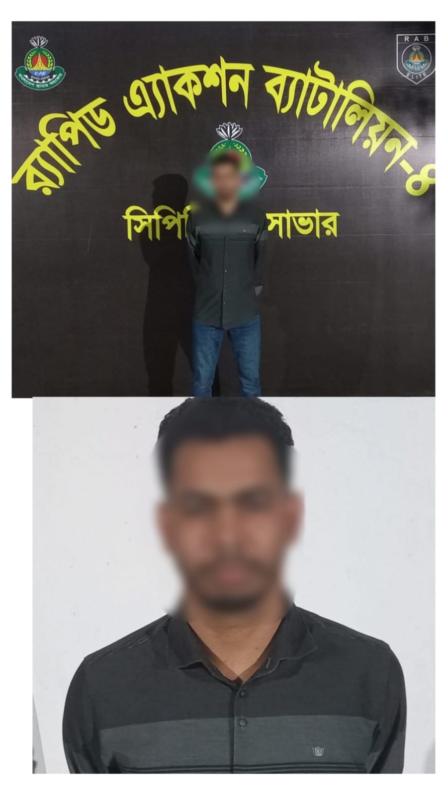 এরই ধারাবাহিকতায় ইং ১০ ডিসেম্বর ২০২৫ তারিখ বিকাল-১৫.৪০ ঘটিকায় ঢাকা জেলার আশুলিয়া থানাধীন জিরাবো নামক এলাকায় অভিযান পরিচালনা করে মৃত্যুদন্ডপ্রাপ্ত ও ২০ হাজার টাকার অর্থদন্ডপ্রাপ্ত পলাতক আসামী মোঃ আলমগীর হোসেন (২৯), পিতা-মৃত ডিল্লাহ শেখ, সাং-চক রাজাপুর, থানা-বাঘা, জেলা-রাজশাহীকে গ্রেফতার করে।ঘটনা সূত্রে জানা যাড, গত ১৪/০১/২০০৭ তারিখে ভিকটিম মমতাজ এর সহিত সূত্রোক্ত মামলার এজাহারনামীয় একমাত্র আসামি মোঃ আলমগীর (২৯) এর বিবাহ বন্ধন হয়। বিবাহের পরে ভিকটিম তার পিতার বাড়ীতে থাকতো এবং উক্ত আসামি ভিকটিমের বাড়ীতে আসা-যাওয়া করতো। একইভাবে উক্ত আসামি গত ১৪/০৪/২০০৭ তারিখে ভিকটিমের বাড়ীতে বেড়াতে আসে এবং বিকাল ১৬.০০ ঘটিকার দিকে তাদের দুজনের মধ্যে রাগারাগি হয়। কথা কাটা-কাটির একপর্যায়ে উক্ত আসামি ভিকটিমকে শ্বাসরোধ করে হত্যা করে ঘরে খুটির সাথে ঝুলিয়ে রাবে। পরবর্তীতে ভিকটিমের মা ও এলাকাবাসীর সহায়তায় উক্ত ঘাতক স্বামী আলমগীর'কে আটক করে পুলিশের নিকট হস্তান্তর করে এবং ভিকটিমের মাতা বাদী হয়ে সিংগাইর থানায় উক্ত আসামির বিরুদ্ধে হত্যা মামলা দায়ের করে। পরবর্তীতে ভিকটিমের পোস্টমার্টাম করে লাশ দাফন করা হয়। উক্ত ঘটনাটি এলাকায় চাঞ্চল্যকর পরিবেশ সৃষ্টি করে। মামলার তদন্ত চলাকালে উক্ত আসামি উচ্চ আদালত থেকে জামিনে মুক্তি লাভ করে। উক্ত আসামির বাড়ী রাজশাহীর বাঘা থানাধীন চক রাজাপুর হওয়া সত্ত্বেও উক্ত আসামি নিজের পরিচয় গোপন করে কুষ্টিয়া জেলার ভেড়ামারা থানায় বসবাস করে। পরবর্তীতে আদালতে হাজিরা না দিয়ে রাজধানীর আশুলিয়া এলাকায় আত্মগোপন করে। আত্মগোপনে থাকাকালীন সে পুনরায় নতুন ভাবে মিথ্যা তথ্য দিয়ে এনআইডি কার্ড তৈরী করে একটি গার্মেন্টসে চাকুরী করে আসছিল। এরই মাঝে তদন্তকারী কর্মকর্তা কর্তৃক মামলার চার্জশীট কোর্টে জমা দিলে বিজ্ঞ আদালত কর্তৃক উক্ত আসামির বিরুদ্ধে আনিত অভিযোগ সত্য প্রমাণিত হওয়ায় ২০১৬ সালে মৃত্যুদন্ড ও ২০ হাজার টাকা অর্থদন্ড প্রদান করে এবং আসামিকে গ্রেফতারে ওয়ারেন্ট জারি করে। আসামিকে গ্রেফতাবের জন্য অন্যান্য আইনশৃঙ্খলা বাহিনীর পাশাপাশি ব্যাব ছায়া তদন্ত শুরু করে এবং আসামীকে গ্রেফতারের জন্য গোয়েন্দা নজরদারী বৃদ্ধি করে। এরই ধারাবাহিকতায় র্যাব-৫, সিপিএসসি, রাজশাহীর ও ব্যাব-৪, সিপিসি-২, সাভার ক্যাম্পের একটি যৌথ আভিযানিক দল অভিযান পরিচালনা করে উক্ত হত্যা মামলার তদন্তকারী কর্মকর্তার অধিযাচনের ভিত্তিতে নারকীয় হত্যাকান্ডের মূলহোতা এজাহারনামীয় একমাত্র আসামি মোঃ আলমগীর (২৯)কে ১০ ডিসেম্বর ২০২৫ তারিখ বিকাল ১৫.৪০ ঘটিকার সময় ঢাকা জেলার আশুলিয়া থানাধীন জিবাবো নামক এলাকা হতে গ্রেফতার করতে সক্ষম হয়। উক্ত আসামিকে ঢাক