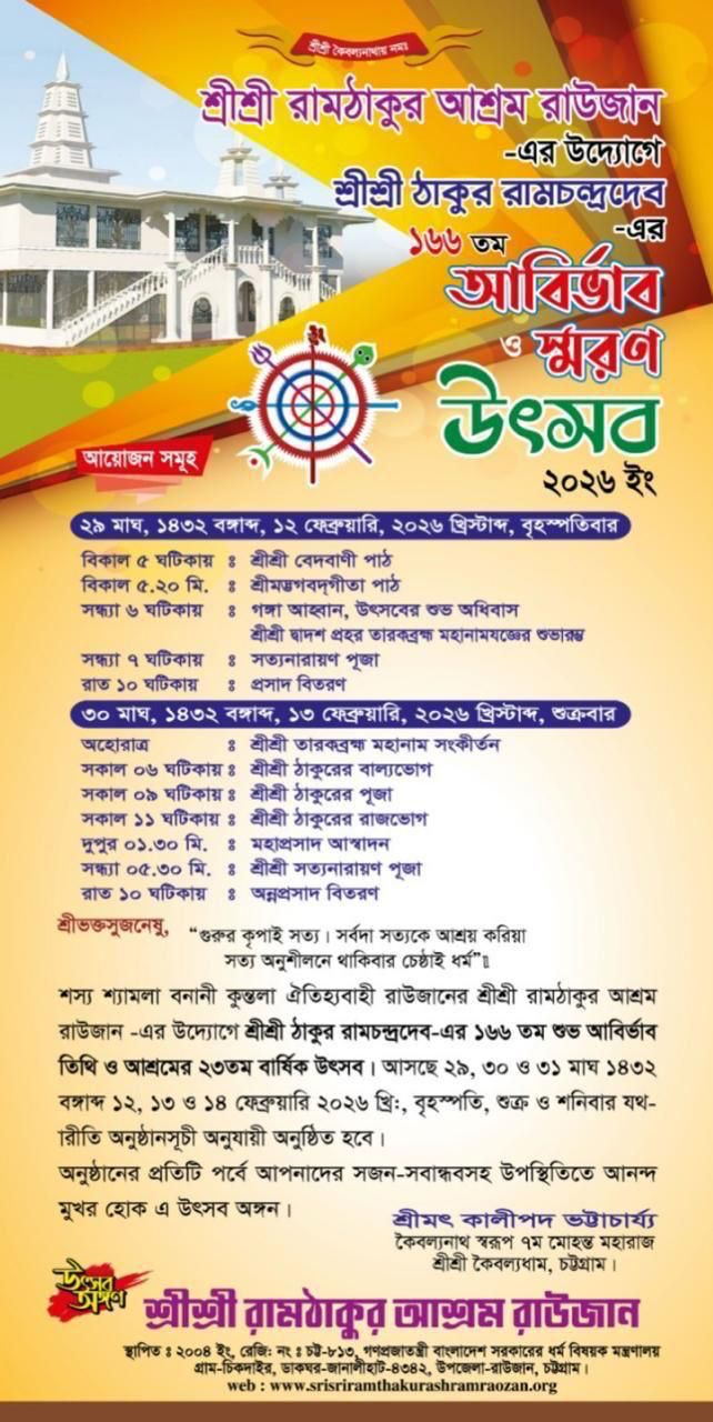 চট্টগ্রামের রাউজানের চিকদাইর গ্রামে সত্য, শুদ্ধতা ও মানবকল্যাণের মহামন্ত্রে উদ্ভাসিত ঐতিহাসিক শ্রীশ্রী রামঠাকুর আশ্রম রাউজানে শ্রীশ্রী ঠাকুর রামচন্দ্রদেবের ১৬৬ তম আবির্ভাব ও স্মরণ উৎসব এ তিন দিনব্যাপী ধর্মীয় ও আধ্যাত্মিক মহোৎসব শুরু হয়েছে। আগামী ২৯, ৩০ ও ৩১ মাঘ ১৪৩২ বঙ্গাব্দ, অর্থাৎ ১২, ১৩ ও ১৪ ফেব্রুয়ারি ২০২৬ খ্রি. (বৃহস্পতিবার, শুক্রবার ও শনিবার) যথাযোগ্য ধর্মীয় ভাবগাম্ভীর্যের মধ্য দিয়ে এ উৎসব অনুষ্ঠিত হবে।