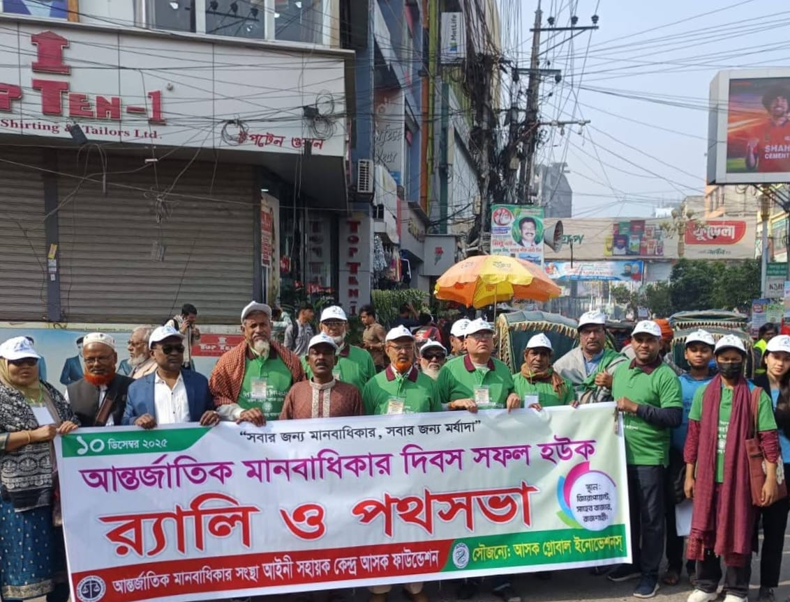 " সবার জন্য মানবাধিকার, সবার জন্য মর্যাদা " এই প্রতিপাদ্যকে সামনে রেখে এবারের ৭৮ তম আন্তর্জাতিক মানবাধিকার দিবস পালন করা হয়। দিবসটি উপলক্ষে ,আন্তর্জাতিক মানবাধিকার সংস্থা আইনি সহায়ক কেন্দ্র আসক ফাউন্ডেশন রাজশাহী কমিটির আয়োজনে, র্যালী ও পথসভা করে। সংস্থার পরিচালক মোঃ আইয়ুব আলী তালুকদারের পরিচালনায়, গতকাল বেলা ১১টায় নগরীর সাহেব বাজার জিরোপয়েন্টে জমায়েত হয়ে একটি র্যালী বের করে, র্যালীটি সাহেব বাজার, মণিচত্তর ও কুমারপাড়া মোড় ঘুরে জিরোপয়েন্টে পথসভা করে। সংস্থার মহানগর কমিটির সভাপতি, অশোক কুমার শাহা'র সভাপতিত্বে প্রধান অতিথি ছিলেন, বীর মুক্তিযোদ্ধা শাহজাহান আলী বরজাহান,বিশেষ অতিথি রাজশাহী সিটি প্রেসক্লাবের সাধারণ সম্পাদক পরিতোষ চৌধুরী আদিত্য, দৈনিক ইত্তেফাক পত্রিকা রাজশাহী প্রতিনিধি, আনিসুজ্জামান আনিস, আসকের বিভাগীয় কমিটির সাধারণ সম্পাদক সাইদুর রহমান, মহানগর কাঁচাবাজার পাইকারি ব্যাবসায়ী সমবায় সমিতির সভাপতি মোঃ আনোয়ার হোসেন দীপক, মানবাধিকারকর্মী আনোয়ার হোসেন আনন, সাহেব বাজার ক্রোকারিজ সমিতির সাধারণ সম্পাদক,অহাইদুল ইসলাম অপুল, ইন্জিনিয়ার মোঃ জাহিদুল ইসলাম জাহিদ, রাজশাহী শিক্ষা বোর্ড কারাতে প্রশিক্ষক মাহামুদুন্নবী তুষার, জলিল বিশ্বাস মার্কেট এর নবনির্বাচিত সাধারণ সম্পাদক মোঃ শরিফুল ইসলাম রাজিব, তাসফিয়া সমাজকল্যাণ ফাউন্ডেশন এর সাধারণ সম্পাদক,,,,, সাদ ফুবস এর সাংগঠনিক সম্পাদক, মোঃ মিজানুর রহমান মেরাজ,মানিক গোপাল পাল, মোঃ সুমন আলীসহ আসকের সদস্য এবং বিভিন্ন সামাজিক ও ব্যাবসায়ী সংগঠনের নেতৃবৃন্দ ও মানবিক ব্যাক্তিবর্গ। সভায় অতিথিগন বক্তব্যে বলেন। ‘জন্মস্থান, জাতি, ধর্ম, বর্ণ, বিশ্বাস, অর্থনৈতিক অবস্থা কিংবা শিক্ষাগত যোগ্যতা নির্বিশেষে মানবাধিকার সর্বজনীন ও সবার জন্য সমান। প্রতিটি মানুষ জন্মগতভাবেই এসব অধিকার লাভ করে। কিন্তু যুগযুগান্তর ধরে দিবসটি পালন করলেও আজো মানবাধিকার নিশ্চিত করণ করা যায়নি। কারন হিসেবে বক্তাগন বলেন, অঞ্চলভিত্তিক গুটিকয়েক, মাদক ব্যবসায়ী,সন্ত্রাসী, দখলবাজ,চাঁদাবাজ, চোর ছিনতাইকারী,ও জুয়াড়ি এবং সুবিধাভোগী ব্যাক্তির অনৈতিক কর্মকান্ডের কারণে আজো মানবাধিকার নিশ্চিত করা যায়নি।