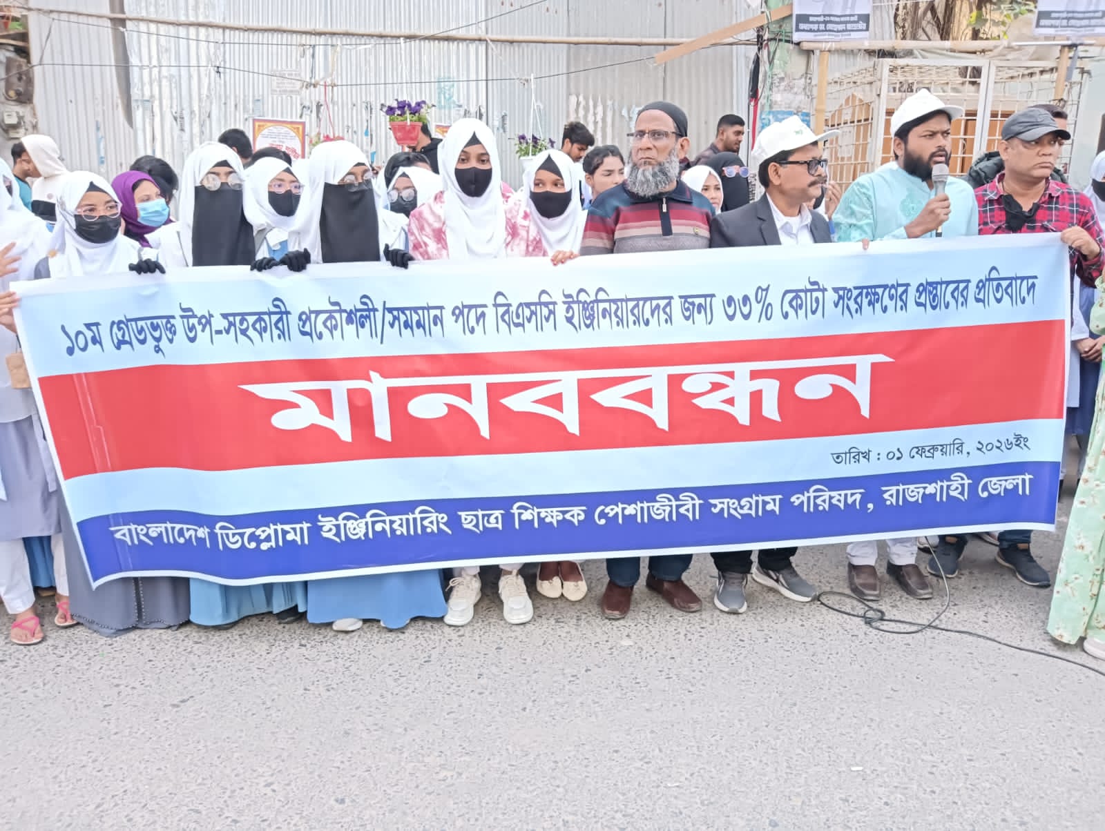 রাজশাহীতে ১০ম গ্রেডভুক্ত উপ-সহকারী প্রকৌশলী এবং সমমানের পদে বিএসসি ইঞ্জিনিয়ারদের জন্য ৩৩ শতাংশ কোটা সংরক্ষনের প্রস্তাবের প্রতিবাদে মানববন্ধন অনুষ্ঠিত হয়েছে। রোববার (১ফেব্রুয়ারি)বেলা সাড়ে ১১ টার দিকে নগরীর সাহেব বাজার জিরো পয়েন্টে বাংলাদেশ ডিপ্লোমা ইঞ্জিনিয়ারিং ছাত্র শিক্ষক পেশাজীবী সংগ্রাম পরিষদ রাজশাহী জেলার আয়োজনে এ মানববন্ধন অনুষ্ঠিত হয়।