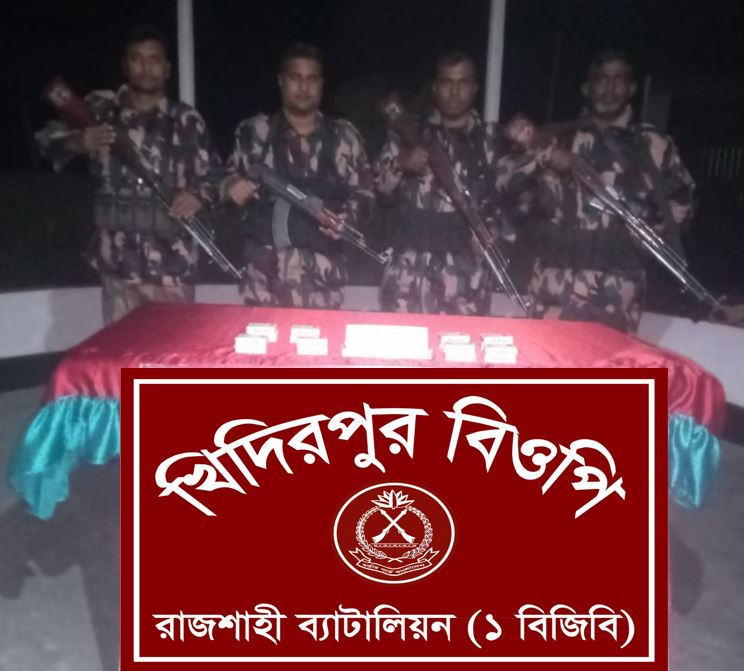 অদ্য ২৪ ডিসেম্বর ২০২৫ তারিখ আনুমানিক ১৮৩০ ঘটিকায় রাজশাহী ব্যাটালিয়ন (১ বিজিবি) এর অধীনস্থ খিদিরপুর বিওপি’র টহল দল কাটাখালী থানাধীন পশ্চিম বাতান নামক স্থানে টহল পরিচালনা করে।