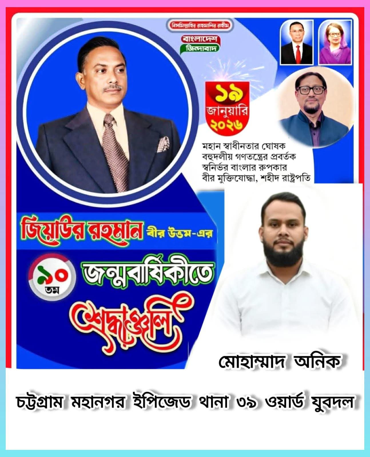 আজ ১৯ জানুয়ারি মহান স্বাধীনতার ঘোষক, বহুদলীয় গণতন্ত্রের প্রবর্তক ও শহীদ রাষ্ট্রপতি জিয়াউর রহমানের ৯০তম জন্মদিন উপলক্ষে গভীর শ্রদ্ধা ও ভালোবাসা নিবেদন করেছেন যুবদল নেতা মোঃ অনিক