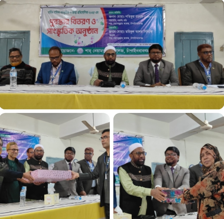 চাঁপাইনবাবগঞ্জে স্বনামধন্য শাহ্ নেয়ামতুল্লাহ কলেজে (১০ ডিসেম্বর) বুধবার সকাল সাড়ে দশ ঘটিকায় মনি উকিল স্মৃতি মিলনায়তনে বার্ষিক সাহিত্য ও সাংস্কৃতিক প্রতিযোগিতা -২০২৫ এর পুরস্কার বিতরণ অনুষ্ঠান আয়োজন করেছে। উক্ত অনুষ্ঠানে সভাপতিত্ব করেন শাহ্ নেয়ামতুল্লাহ কলেজের অধ্যক্ষ মোঃ তরিকুল আলম সিদ্দিকী। স্বাগত বক্তব্য দেন স্টাফ কাউন্সিলের সাধারণ সম্পাদক ও ফিন্যান্সের সহকারী অধ্যাপক মাহফুজুল হাসান ডন। উক্ত অনুষ্ঠানে প্রধান অতিথি হিসেবে ছিলেন চাঁপাইনবাবগঞ্জ-৩ আসনের সাবেক এমপি ও শাহ্ নেয়ামতুল্লাহ কলেজের গভনিং বডির সভাপতি মোঃ লতিফুর রহমান। অনুষ্ঠানে আরোও অতিথিরা ছিলেন, অত্র কলেজের উপাধ্যক্ষ মোঃ শরিফুর ইসলাম,সাবেক (ভারপ্রাপ্ত) অধ্যক্ষ মোঃ কামরুজ্জামান, অত্র কলেজের ক্রীড়া কমিটি আহবায়ক ও রসায়ন বিভাগের সহকারী অধ্যাপক মোঃ হাবিবুর রহমান, ইংরেজি ও শিক্ষক প্রতিনিধি প্রভাষক নওসাবাহ নওরীন,ইসলাম শিক্ষা ও শিক্ষক প্রতিনিধি প্রভাষক মোঃ ফরহাত হোসেন ও মার্কেটিং ও শিক্ষক প্রতিনিধি মোঃ আব্দুল্লাহ প্রমুখ। উক্ত অনুষ্ঠানে বার্ষিক সাহিত্য ও সাংস্কৃতিক প্রতিযোগিতায় ১৪ টি বিষয়ের অংশগহনকারীর মধ্যে ৪২ জন শিক্ষার্থী বিজয়ী হয়েছে। ক্রীড়া প্রতিযোগিতায় ১৩ টি খেলায় অংশগ্রহনকারীর মধ্যে ৩৯ জন শিক্ষার্থী বিজয়ী হয়েছে। শিক্ষক - শিক্ষিকা ১২ টি বিষয়ে সাহিত্য ও সাংস্কৃতিক এবং ক্রীড়া প্রতিযোগিতায় অংশগ্রহণকারীর মধ্যে ৩৬ জন বিজয়ী হয়েছেন এবং অত্র কলেজের কর্মচারীরা ৩ টি ক্রীড়া প্রতিযোগিতায় অংশগ্রহণকারীর মধ্যে ৯ জন বিজয়ী হয়েছেন। প্রত্যেক বিজয়ীকে পুরস্কার তুলে দেন প্রধান অতিথি সহ অতিথিবৃন্দরা।পুরস্কার বিতরণ শেষে সাংস্কৃতিক অনুষ্ঠান উপভোগ করেন অতিথি সহ শিক্ষকমণ্ডলী ও শিক্ষার্থীরা।