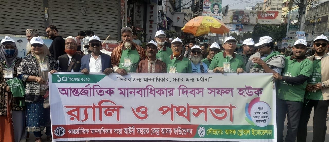 ,আন্তর্জাতিক মানবাধিকার সংস্থা আইনি সহায়ক কেন্দ্র আসক ফাউন্ডেশন রাজশাহী কমিটির আয়োজনে, র্যালী ও পথসভা করে। সংস্থার পরিচালক মোঃ আইয়ুব আলী তালুকদারের পরিচালনায়, গতকাল বেলা ১১টায় নগরীর সাহেব বাজার জিরোপয়েন্টে জমায়েত হয়ে একটি র্যালী বের করে, র্যালীটি সাহেব বাজার, মণিচত্তর ও কুমারপাড়া মোড় ঘুরে জিরোপয়েন্টে পথসভা করে। সংস্থার মহানগর কমিটির সভাপতি, অশোক কুমার শাহা'র সভাপতিত্বে প্রধান অতিথি ছিলেন, বীর মুক্তিযোদ্ধা শাহজাহান আলী বরজাহান,বিশেষ অতিথি রাজশাহী সিটি প্রেসক্লাবের সাধারণ সম্পাদক পরিতোষ চৌধুরী আদিত্য, দৈনিক ইত্তেফাক পত্রিকা রাজশাহী প্রতিনিধি, আনিসুজ্জামান আনিস, আসকের বিভাগীয় কমিটির সাধারণ সম্পাদক সাইদুর রহমান, মহানগর কাঁচাবাজার পাইকারি ব্যাবসায়ী সমবায় সমিতির সভাপতি মোঃ আনোয়ার হোসেন দীপক, মানবাধিকারকর্মী আনোয়ার হোসেন আনন, সাহেব বাজার ক্রোকারিজ সমিতির সাধারণ সম্পাদক,অহাইদুল ইসলাম অপুল, ইন্জিনিয়ার মোঃ জাহিদুল ইসলাম জাহিদ, রাজশাহী শিক্ষা বোর্ড কারাতে প্রশিক্ষক মাহামুদুন্নবী তুষার, সমাজসেবক বিশিষ্ট ব্যাবসায়ী মোঃ তাহেরুল ইসলাম, তাহের আলী, জলিল বিশ্বাস মার্কেট এর নবনির্বাচিত সাধারণ সম্পাদক মোঃ শরিফুল ইসলাম রাজিব, তাসফিয়া সমাজকল্যাণ ফাউন্ডেশন এর সাধারণ সম্পাদক,,,,, সাদ ফুবস এর সাংগঠনিক সম্পাদক, মোঃ মিজানুর রহমান মেরাজ,মানিক গোপাল পাল, মোঃ সুমন আলীসহ আসকের সদস্য এবং বিভিন্ন সামাজিক ও ব্যাবসায়ী সংগঠনের নেতৃবৃন্দ ও মানবিক ব্যাক্তিবর্গ। সভায় অতিথিগন বক্তব্যে বলেন। ‘জন্মস্থান, জাতি, ধর্ম, বর্ণ, বিশ্বাস, অর্থনৈতিক অবস্থা কিংবা শিক্ষাগত যোগ্যতা নির্বিশেষে মানবাধিকার সর্বজনীন ও সবার জন্য সমান। প্রতিটি মানুষ জন্মগতভাবেই এসব অধিকার লাভ করে। কিন্তু যুগযুগান্তর ধরে দিবসটি পালন করলেও আজো মানবাধিকার নিশ্চিত করণ করা যায়নি। কারন হিসেবে বক্তাগন বলেন, অঞ্চলভিত্তিক গুটিকয়েক, মাদক ব্যবসায়ী,সন্ত্রাসী, দখলবাজ,চাঁদাবাজ, চোর ছিনতাইকারী,ও জুয়াড়ি এবং সুবিধাভোগী ব্যাক্তির অনৈতিক কর্মকান্ডের কারণে আজো মানবাধিকার নিশ্চিত করা যায়নি।
