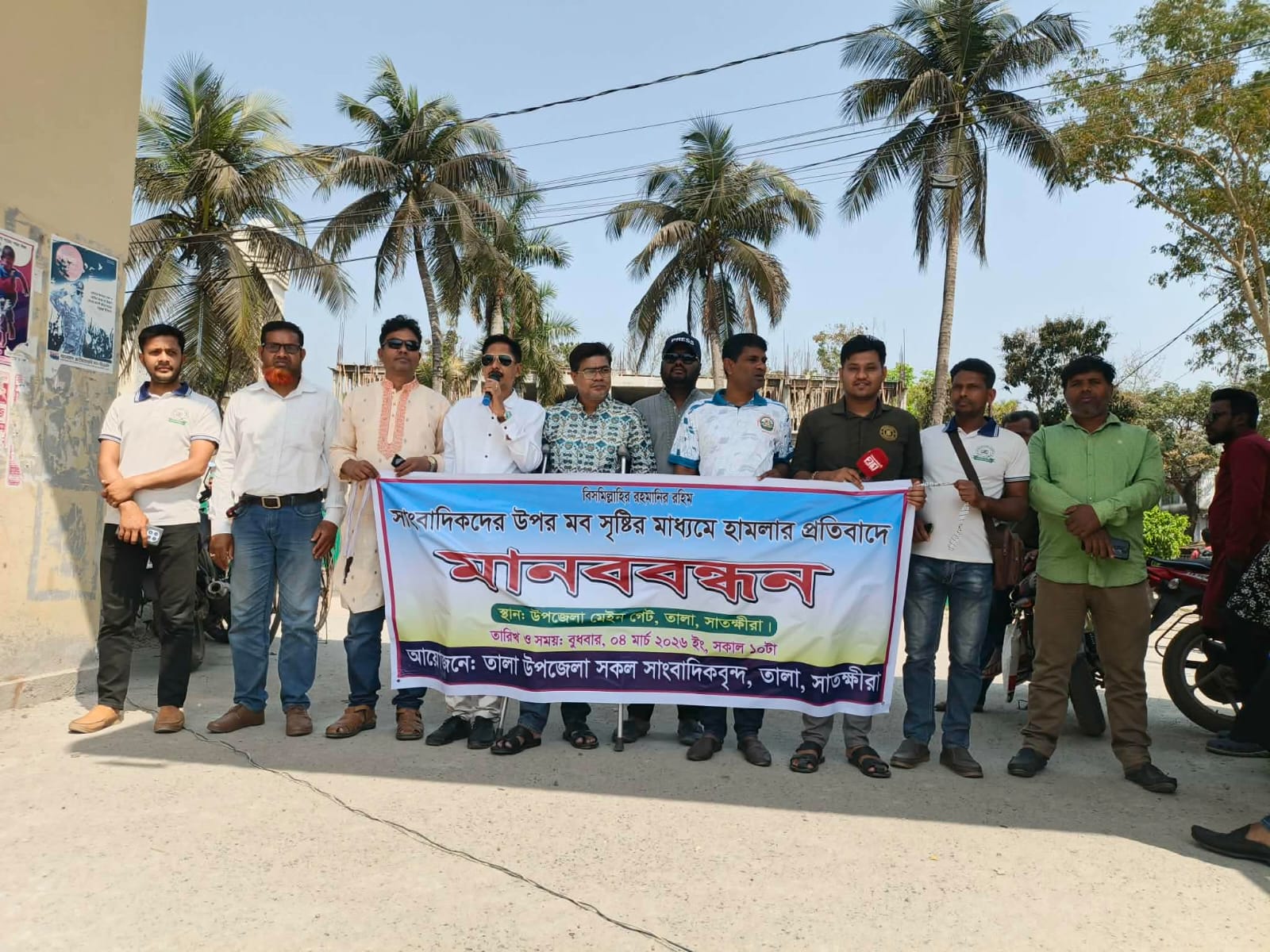 সাতক্ষীরার সাংবাদিকদের উপরে মব সৃষ্টি করে নির্যাতনের প্রতিবাদে দোষীদের শাস্তির দাবিতে মানববন্ধন অনুষ্ঠিত হয়েছে। বুধবার ৪ঠা মার্চ সকাল ১০ ঘটিকার সময় তালা উপজেলা প্রধান ফটকের সামনে উপজেলায় কর্মরত সাংবাদিকদের সকল ইউনিটের সম্মিলিত আয়োজনে এ মানববন্ধন অনুষ্ঠিত হয়। তালা প্রেসক্লাবের একাংশের সভাপতি এম এ হাকিমের সভাপতিত্বে ও তালা উপজেলা প্রেসক্লাবের সভাপতি আকবর হোসেনের সঞ্চালনায় উক্ত মানববন্ধনে বক্তব্য রাখেন উপজেলা প্রেসক্লাবের সহ সভাপতি সাইদুর রহমান সাঈদ, যুগ্ন সাধারণ সম্পাদক শাহিন আলম,সহ-সাংগঠনিক সম্পাদক গোলাম রাব্বানী, সহ-সাংগঠনিক আতাউর রহমান, দপ্তর সম্পাদক হাফিজুর রহমান, কোষাধক্ষ্য এইচ এম মুফতি এনামুল হক, উপজেলা প্রেসক্লাবের সদস্য সাংবাদিক জহর হাসান সাগর । সাংবাদিক সাঈদ সম্রাট, তালা প্রেসক্লাবের সাধারণ সম্পাদক ফারুক জোয়াদ্দার , সহ-সভাপতি এম এ ফয়সাল, সাংগঠনিক সম্পাদক জাহাঙ্গীর হোসেন, সাংবাদিক জি এম খলিলুর রহমান লিতু, সাংবাদিক লিয়াকত হোসেন, শেখ ইমরান হোসেন, সাংবাদিক শেখ মখফুর রহমান জান্টু, আব্দুল মতিন, সাতক্ষীরা প্রেসক্লাবের সদস্য সানজিদুল হক ইমন, নাজমুল হাসান মাহি, প্রমুখ। বক্তারা তাদের বক্তব্যের সম্প্রতি শ্যামনগর উপজেলা প্রেসক্লাবের সভাপতি সামিউল মনিরের উপর ্সন্ত্রাসী হামলা ও পাটকেলঘাটায় দুইজন সাংবাদিকের উপর মব সৃষ্টি করে হামলা সহ চারজন সাংবাদিকের নির্যাতন ও মিথ্যা চাঁদাবাজির মামলা দিয়ে ফাঁসানোর তীব্র নিন্দা ও দোষীদের শাস্তির দাবি জানান। সম্প্রতি ঢাকা থেকে প্রকাশিত দৈনিক সমকাল পত্রিকার শ্যামনগর উপজেলা প্রতিনিধি ও শ্যামনগর উপজেলা প্রেসক্লাবের সভাপতি সামিউল মনির "যুবলীগ, যুবদল ও যুব জামাত মিলে বালুমহাল লুট "" শীর্ষক সংবাদ প্রকাশ করায় সন্ত্রাসী হামলার শিকার হয়। তাছাড়া সম্প্রতি পাটকেলঘাটা জোড়া টাওয়ার রোডে ১/১ খতিয়ানের সরকারি সম্পত্তি ১৮ লক্ষ টাকায় হস্তান্তরের তথ্য আনতে গেলে