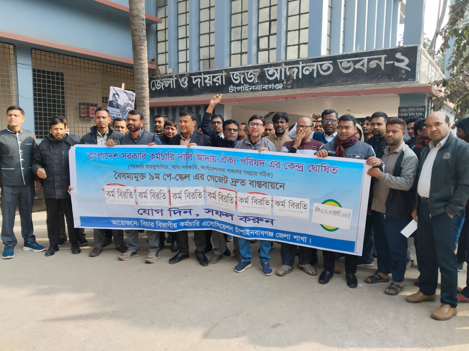 বাংলাদেশ সরকারি কর্মচারী দাবি আদায় ঐক্য পরিষদের কেন্দ্রীয় কর্মসূচির অংশ হিসেবে সরকারি স্বায়ত্তশাসিত, আধা-সরকারি ও কর্পোরেশনসহ সকল কর্মচারীর সমন্বয়ে গঠিত বৈষম্যমুক্ত ৯ম পে-স্কেল এর গেজেট দ্রুত বাস্তবায়নের দাবিতে কর্মবিরতি পালন করেছে চাঁপাইনবাবগঞ্জ জেলা শাখার বিচার বিভাগীয় কর্মচারী এসোসিয়েশন।