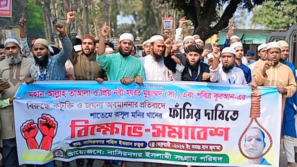 নিহারেন্দু চক্রবর্তী,নাসিরনগর, ব্রাহ্মণবাড়িয়াঃ ব্রাহ্মণবাড়িয়ার নাসিরনগর উপজেলায় মহানবী হযরত মুহাম্মদ (সা.)–এর শানে কটূক্তির অভিযোগে এক ব্যক্তির শাস্তির দাবিতে বিক্ষোভ মিছিল ও সমাবেশ করেছেন স্থানীয় ধর্মভিত্তিক সংগঠনের নেতা–কর্মীরা। আজ শুক্রবার (২৭